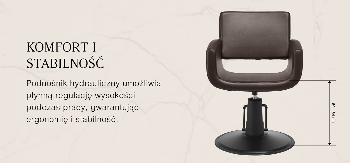 Trwały podnośnik hydrauliczny pozwala regulować wysokość siedziska w zakresie od 50 do 64 cm, również w trakcie użytkowania. Dzięki temu praca staje się bardziej ergonomiczna i mniej obciążająca, a pozycję można dopasować zarówno do wzrostu fryzjera, jak i klienta. Wygodne oparcie zapewnia stabilne podparcie pleców i ułatwia przyjęcie komfortowej pozycji, co jest szczególnie istotne podczas długich zabiegów, zwiększając komfort i satysfakcję klienta.