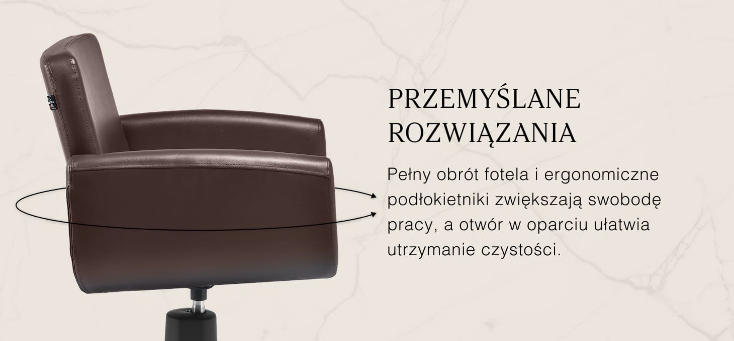 Ergonomiczne podłokietniki wspierają prawidłową postawę klienta, zapewniając wygodę i ułatwiając precyzyjne cięcia oraz stylizacje. Mechanizm pełnego obrotu zapewnia większą mobilność i swobodę ruchów, sprawiając, że praca fryzjera jest płynniejsza, bardziej efektywna i mniej obciążająca. Praktyczny otwór między oparciem a siedziskiem ułatwia utrzymanie czystości i szybkie usuwanie włosów z trudno dostępnych miejsc. Dzięki temu przygotowanie stanowiska na kolejnego klienta przebiega sprawnie i higienicznie.