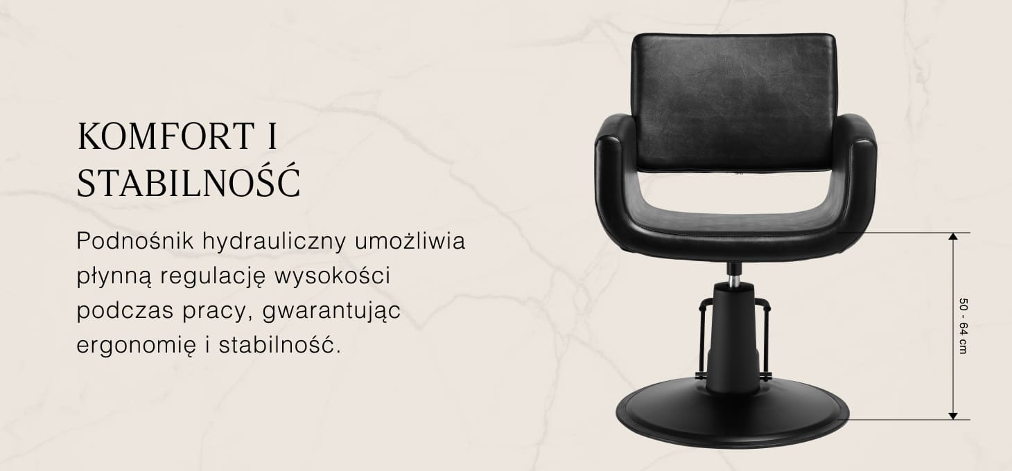 Trwały podnośnik hydrauliczny pozwala regulować wysokość siedziska w zakresie od 50 do 64 cm, również w trakcie użytkowania. Dzięki temu praca staje się bardziej ergonomiczna i mniej obciążająca, a pozycję można dopasować zarówno do wzrostu fryzjera, jak i klienta. Wygodne oparcie zapewnia stabilne podparcie pleców i ułatwia przyjęcie komfortowej pozycji, co jest szczególnie istotne podczas długich zabiegów, zwiększając komfort i satysfakcję klienta.