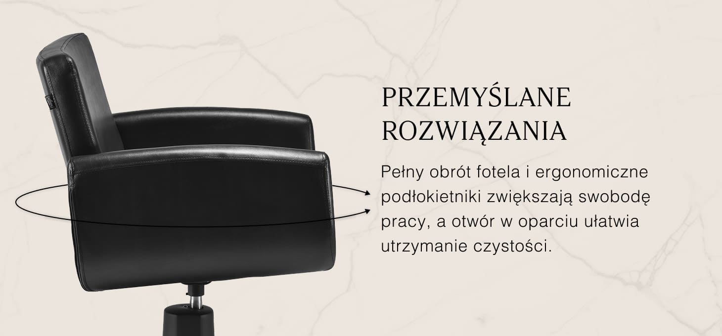 Ergonomiczne podłokietniki wspierają prawidłową postawę klienta, zapewniając wygodę i ułatwiając precyzyjne cięcia oraz stylizacje. Mechanizm pełnego obrotu zapewnia większą mobilność i swobodę ruchów, sprawiając, że praca fryzjera jest płynniejsza, bardziej efektywna i mniej obciążająca. Praktyczny otwór między oparciem a siedziskiem ułatwia utrzymanie czystości i szybkie usuwanie włosów z trudno dostępnych miejsc. Dzięki temu przygotowanie stanowiska na kolejnego klienta przebiega sprawnie i higienicznie.