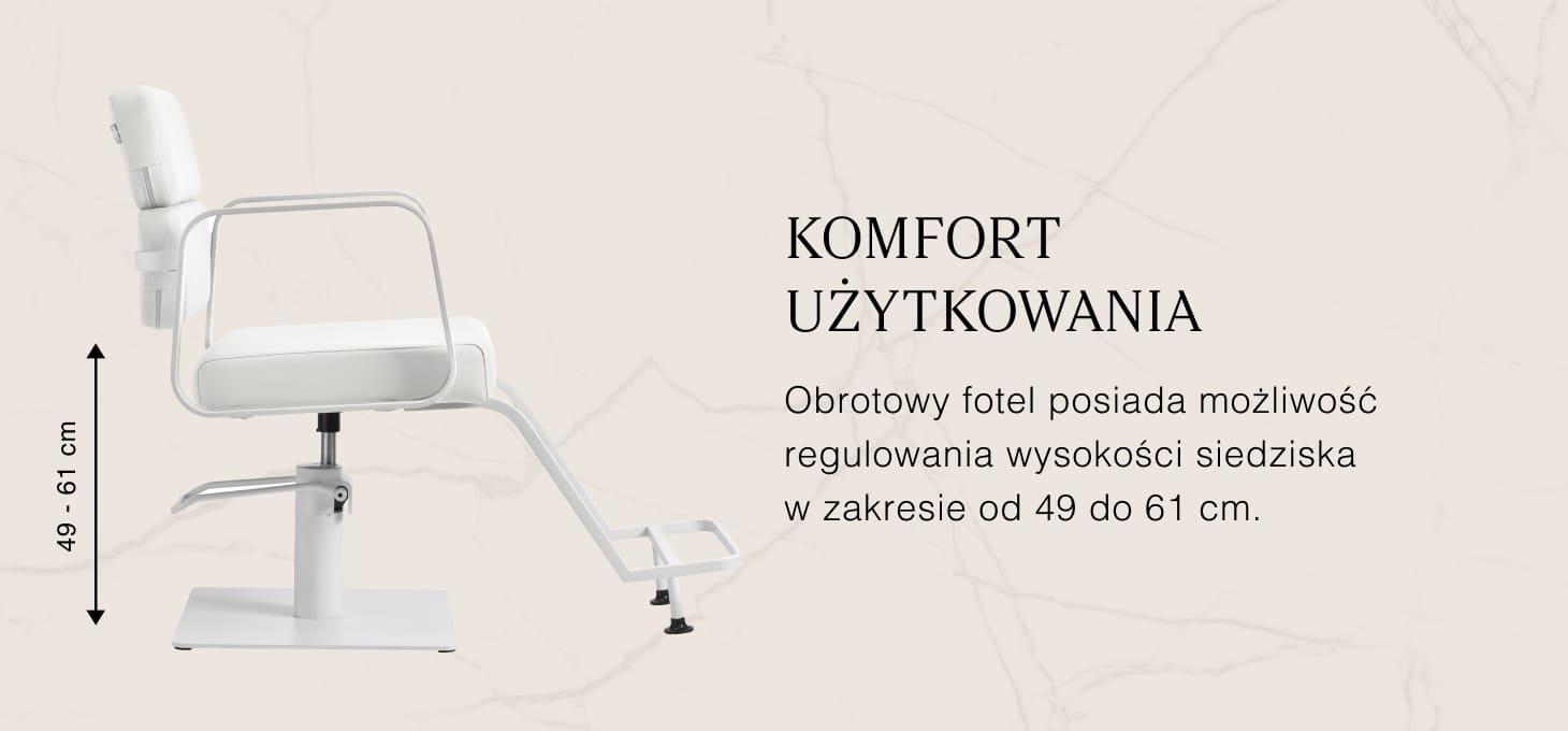 Trwały podnośnik hydrauliczny pozwala dostosować poziom siedziska w granicach 49-61 cm – nawet w momencie, gdy klient siedzi na fotelu. Zapewnia bardziej ergonomiczną pracę, umożliwiając dopasowanie poziomu siedziska do wzrostu zarówno klienta, jak i fryzjera. Ciekawe wizualnie oparcie pozwala na zajęcie dogodnej pozycji, zapewniając doskonałe wsparcie pleców, co ma znaczenie zwłaszcza w przypadku wielogodzinnych zabiegów. Dużym plusem tego modelu jest otwór pozostawiony pomiędzy oparciem a siedziskiem. Ułatwia on zachowanie czystości w salonie, pozwalając w łatwy sposób wymieść włosy z każdego zakamarka fotela. Pozwala to usprawnić przygotowanie stanowiska pracy pomiędzy klientami.