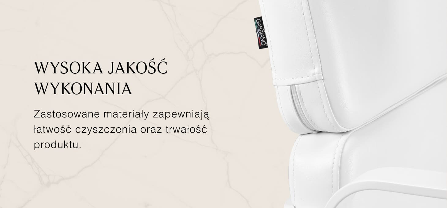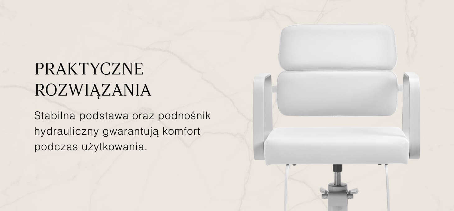 Wypełnienie z trwałej, odpornej na odkształcenia pianki oraz obicie wykonane z przyjemnej w dotyku skóry syntetycznej zapewniają trwałość mebla i jego komfortowe użytkowanie przez długi czas. Sprawiają również, że sprzęt jest odporny na wilgoć, wytrzymały oraz łatwy do czyszczenia. Pokrycie w odcieniach bieli nadaje mu wyjątkowego charakteru. Sprzęt wyróżnia nowoczesny design, który sprawia, że fotel będzie doskonale prezentować się w wielu profesjonalnych salonach.