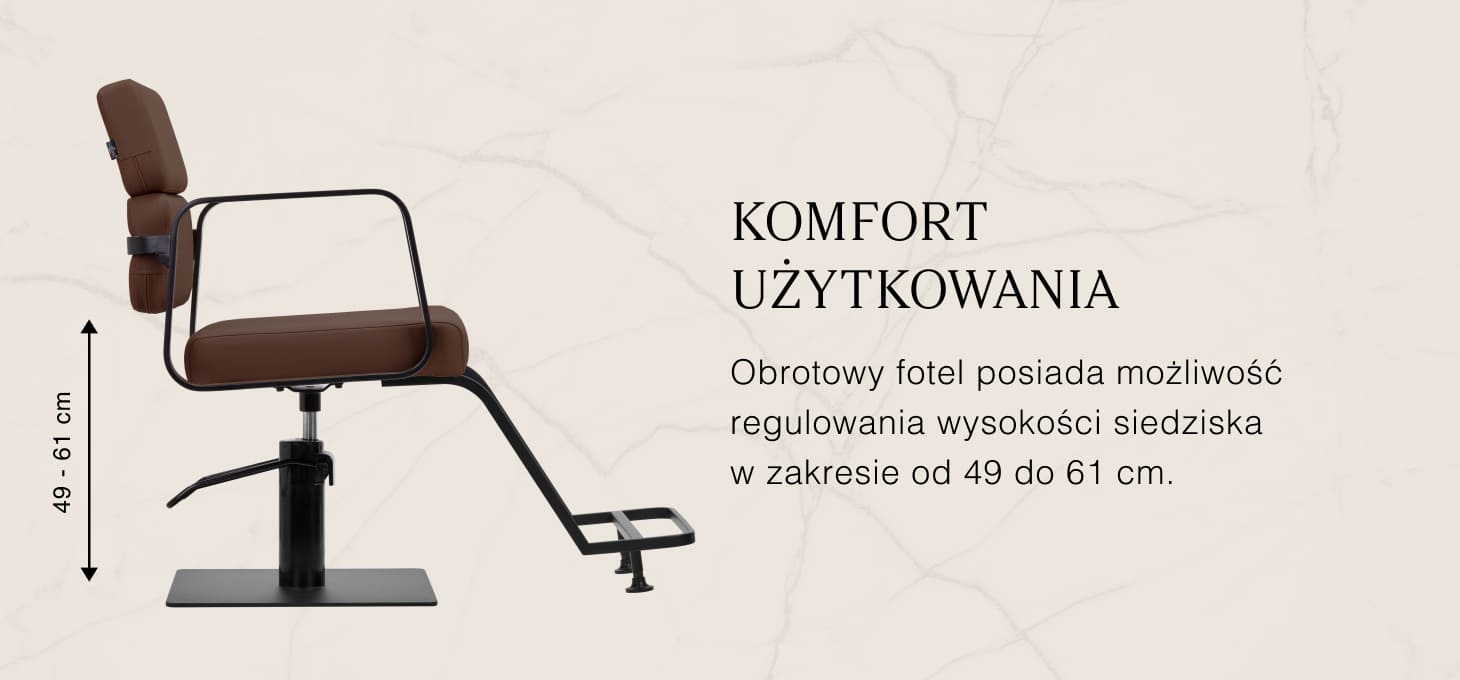 Trwały podnośnik hydrauliczny pozwala dostosować poziom siedziska w granicach 49-61 cm – nawet w momencie, gdy klient siedzi na fotelu. Zapewnia bardziej ergonomiczną pracę, umożliwiając dopasowanie poziomu siedziska do wzrostu zarówno klienta, jak i fryzjera. Ciekawe wizualnie oparcie pozwala na zajęcie dogodnej pozycji, zapewniając doskonałe wsparcie pleców, co ma znaczenie zwłaszcza w przypadku wielogodzinnych zabiegów. Dużym plusem tego modelu jest otwór pozostawiony pomiędzy oparciem a siedziskiem. Ułatwia on zachowanie czystości w salonie, pozwalając w łatwy sposób wymieść włosy z każdego zakamarka fotela. Pozwala to usprawnić przygotowanie stanowiska pracy pomiędzy klientami.