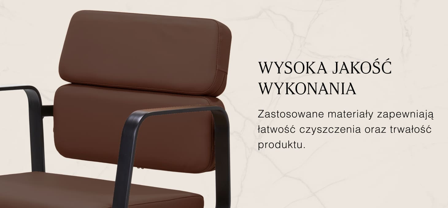 Mechanizm pełnego obrotu, w który jest wyposażony fotel, sprawia, że praca fryzjera staje się bardziej efektywna i wygodna. Solidna, płaska podstawa w kształcie kwadratu gwarantuje stabilność w trakcie użytkowania. Matowo wykończona, gładka powierzchnia nadaje elementowi elegancki wygląd i sprawia, że ten jest łatwy do utrzymania w czystości. Wygodne siedzisko z wypełnieniem z pianki zapewnia wysoki komfort użytkowania, nawet podczas wielogodzinnych zabiegów. Geometryczne, metalowe podłokietniki pozwalają na prawidłowe ułożenie barków klienta – sprawia to, że nie chowa głowy w ramionach ani się nie garbi – co wyraźnie ułatwia wykonywanie precyzyjnych zabiegów, w tym strzyżenia. Dedykowany do tego modelu stylowy podnóżek zapewnia stabilne oparcie dla stóp użytkownika.
