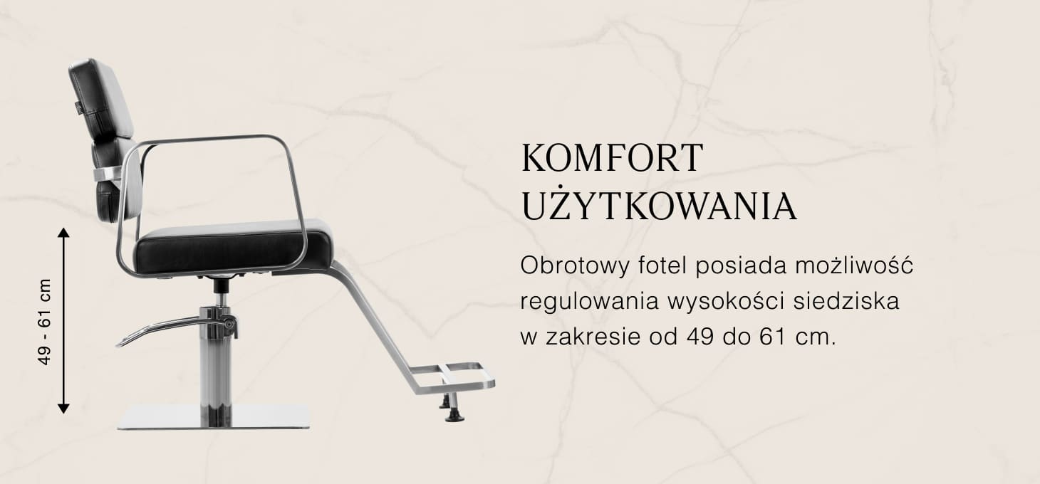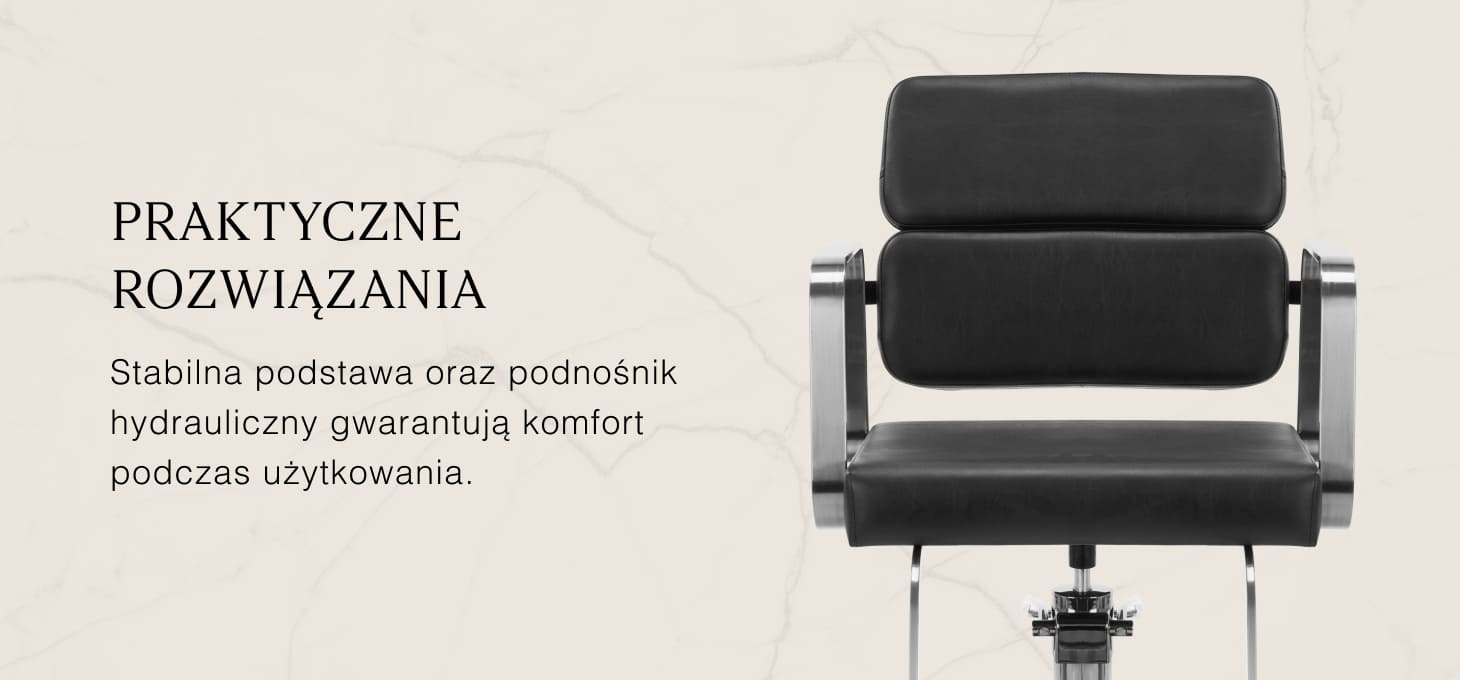 Mechanizm pełnego obrotu, w który jest wyposażony fotel, sprawia, że praca fryzjera staje się bardziej efektywna i wygodna. Solidna, płaska podstawa w kształcie kwadratu gwarantuje stabilność w trakcie użytkowania. Matowo wykończona, gładka powierzchnia nadaje elementowi elegancki wygląd i sprawia, że ten jest łatwy do utrzymania w czystości. Wygodne siedzisko z wypełnieniem z pianki zapewnia wysoki komfort użytkowania, nawet podczas wielogodzinnych zabiegów. Geometryczne, metalowe podłokietniki pozwalają na prawidłowe ułożenie barków klienta – sprawia to, że nie chowa głowy w ramionach ani się nie garbi – co wyraźnie ułatwia wykonywanie precyzyjnych zabiegów, w tym strzyżenia. Dedykowany do tego modelu stylowy podnóżek zapewnia stabilne oparcie dla stóp użytkownika.