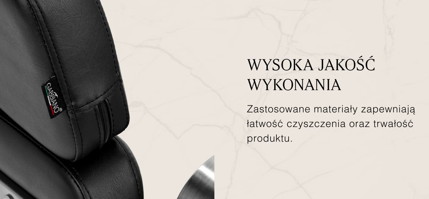 Wypełnienie z trwałej, odpornej na odkształcenia pianki oraz obicie wykonane z przyjemnej w dotyku skóry syntetycznej zapewniają trwałość mebla i jego komfortowe użytkowanie przez długi czas. Sprawiają również, że sprzęt jest odporny na wilgoć, wytrzymały oraz łatwy do czyszczenia. Pokrycie w odcieniach czerni nadaje mu wyjątkowego charakteru. Sprzęt wyróżnia nowoczesny design, który sprawia, że fotel będzie doskonale prezentować się w wielu profesjonalnych salonach.