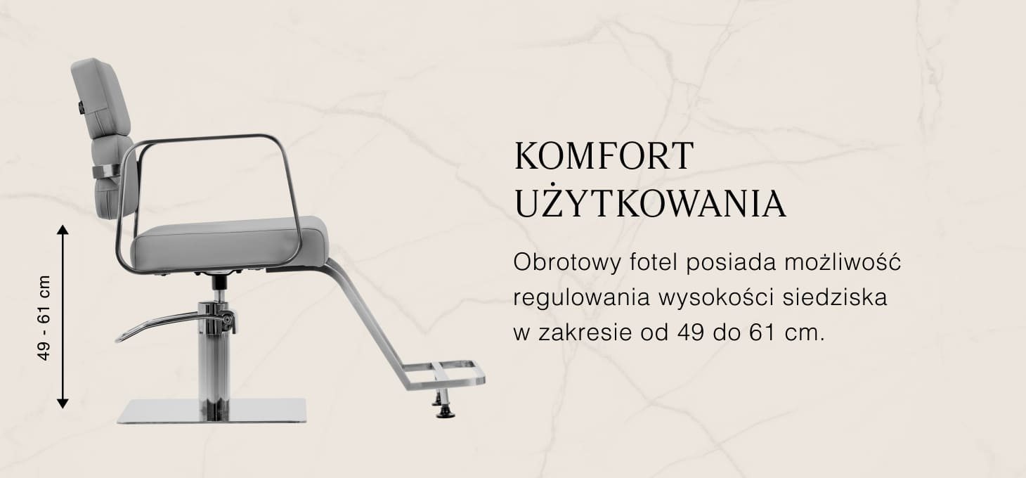 Trwały podnośnik hydrauliczny pozwala dostosować poziom siedziska w granicach 49-61 cm – nawet w momencie, gdy klient siedzi na fotelu. Zapewnia bardziej ergonomiczną pracę, umożliwiając dopasowanie poziomu siedziska do wzrostu zarówno klienta, jak i fryzjera. Ciekawe wizualnie oparcie pozwala na zajęcie dogodnej pozycji, zapewniając doskonałe wsparcie pleców, co ma znaczenie zwłaszcza w przypadku wielogodzinnych zabiegów. Dużym plusem tego modelu jest otwór pozostawiony pomiędzy oparciem a siedziskiem. Ułatwia on zachowanie czystości w salonie, pozwalając w łatwy sposób wymieść włosy z każdego zakamarka fotela. Pozwala to usprawnić przygotowanie stanowiska pracy pomiędzy klientami.