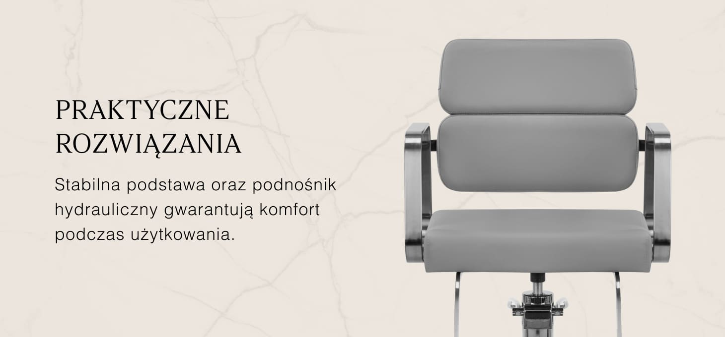 Mechanizm pełnego obrotu, w który jest wyposażony fotel, sprawia, że praca fryzjera staje się bardziej efektywna i wygodna. Solidna, płaska podstawa w kształcie kwadratu gwarantuje stabilność w trakcie użytkowania. Matowo wykończona, gładka powierzchnia nadaje elementowi elegancki wygląd i sprawia, że ten jest łatwy do utrzymania w czystości. Wygodne siedzisko z wypełnieniem z pianki zapewnia wysoki komfort użytkowania, nawet podczas wielogodzinnych zabiegów. Geometryczne, metalowe podłokietniki pozwalają na prawidłowe ułożenie barków klienta – sprawia to, że nie chowa głowy w ramionach ani się nie garbi – co wyraźnie ułatwia wykonywanie precyzyjnych zabiegów, w tym strzyżenia. Dedykowany do tego modelu stylowy podnóżek zapewnia stabilne oparcie dla stóp użytkownika.