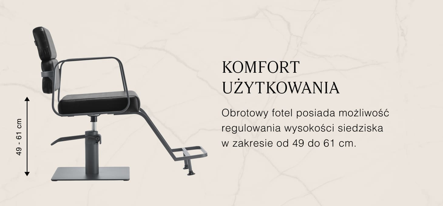 Trwały podnośnik hydrauliczny pozwala dostosować poziom siedziska w granicach 49-61 cm – nawet w momencie, gdy klient siedzi na fotelu. Zapewnia bardziej ergonomiczną pracę, umożliwiając dopasowanie poziomu siedziska do wzrostu zarówno klienta, jak i fryzjera. Ciekawe wizualnie oparcie pozwala na zajęcie dogodnej pozycji, zapewniając doskonałe wsparcie pleców, co ma znaczenie zwłaszcza w przypadku wielogodzinnych zabiegów. Dużym plusem tego modelu jest otwór pozostawiony pomiędzy oparciem a siedziskiem. Ułatwia on zachowanie czystości w salonie, pozwalając w łatwy sposób wymieść włosy z każdego zakamarka fotela. Pozwala to usprawnić przygotowanie stanowiska pracy pomiędzy klientami.