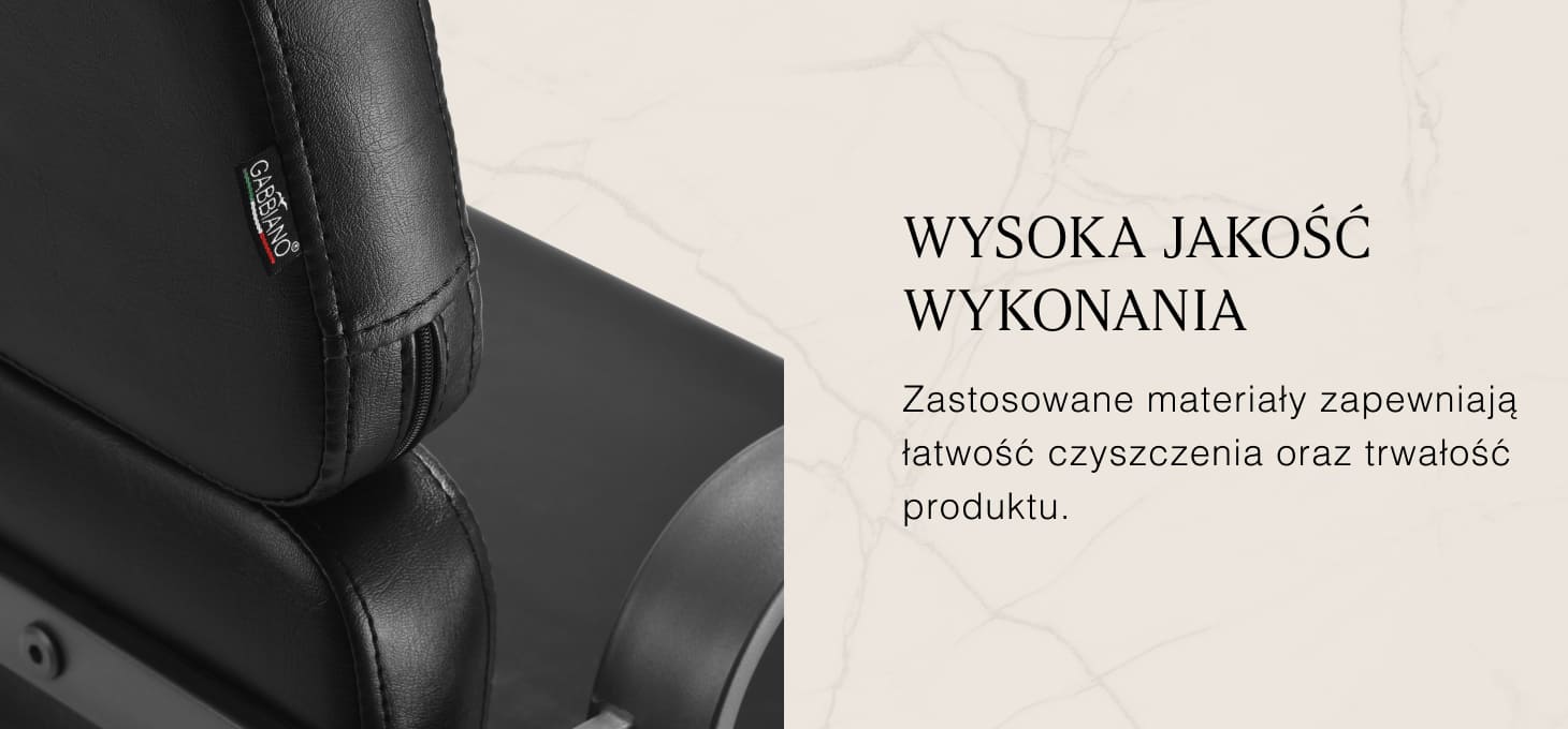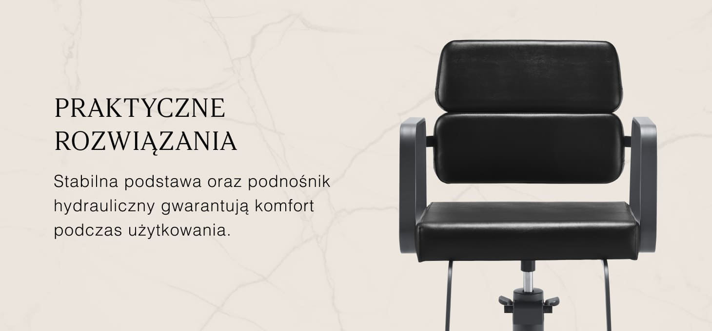 Wypełnienie z trwałej, odpornej na odkształcenia pianki oraz obicie wykonane z przyjemnej w dotyku skóry syntetycznej zapewniają trwałość mebla i jego komfortowe użytkowanie przez długi czas. Sprawiają również, że sprzęt jest odporny na wilgoć, wytrzymały oraz łatwy do czyszczenia. Pokrycie w odcieniach czerni nadaje mu wyjątkowego charakteru. Sprzęt wyróżnia nowoczesny design, który sprawia, że fotel będzie doskonale prezentować się w wielu profesjonalnych salonach.