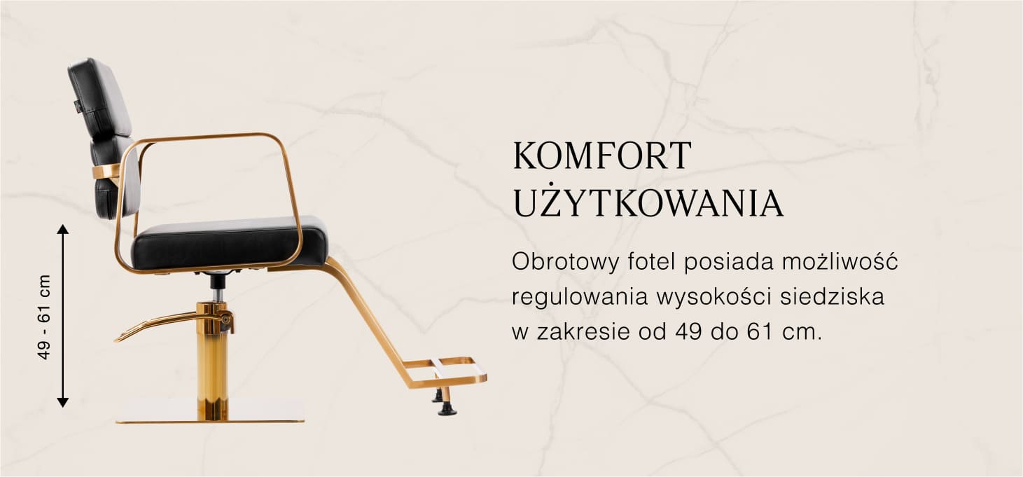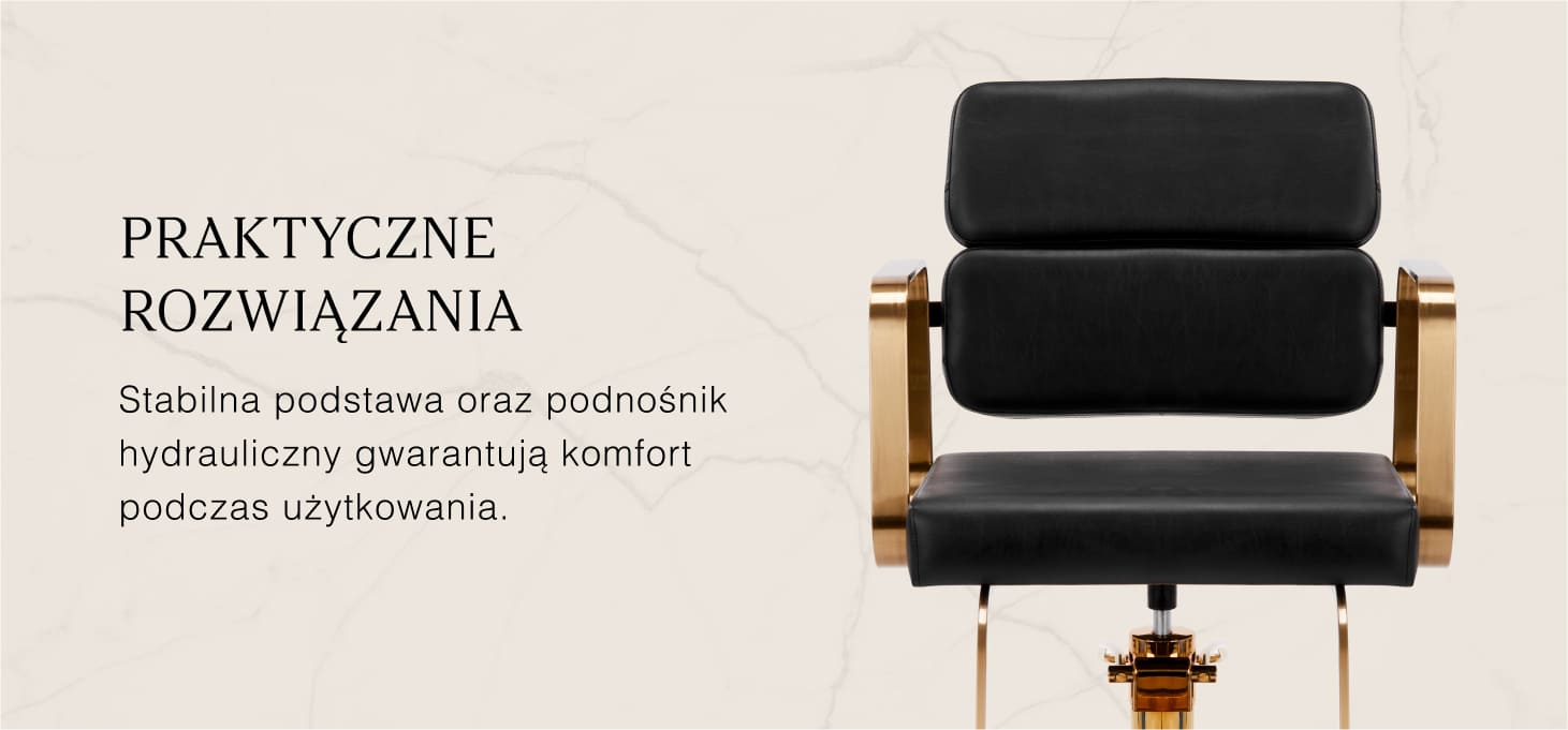 Mechanizm pełnego obrotu, w który jest wyposażony fotel, sprawia, że praca fryzjera staje się bardziej efektywna i wygodna. Solidna, płaska podstawa w kształcie kwadratu gwarantuje stabilność w trakcie użytkowania. Matowo wykończona, gładka powierzchnia nadaje elementowi elegancki wygląd i sprawia, że ten jest łatwy do utrzymania w czystości. Wygodne siedzisko z wypełnieniem z pianki zapewnia wysoki komfort użytkowania, nawet podczas wielogodzinnych zabiegów. Geometryczne, metalowe podłokietniki w odcieniach złota pozwalają na prawidłowe ułożenie barków klienta – sprawia to, że nie chowa głowy w ramionach ani się nie garbi – co wyraźnie ułatwia wykonywanie precyzyjnych zabiegów, w tym strzyżenia. Dedykowany do tego modelu stylowy podnóżek zapewnia stabilne oparcie dla stóp użytkownika.