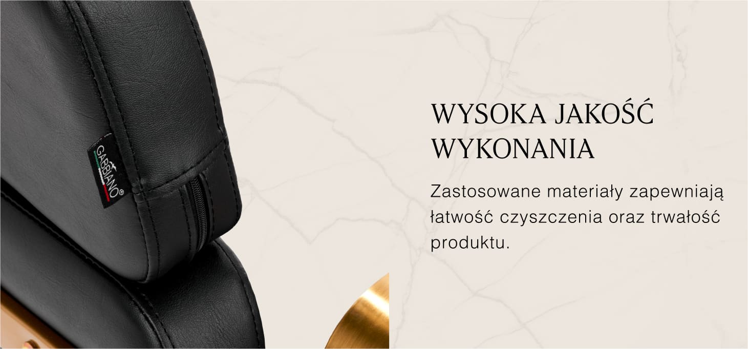 Wypełnienie z trwałej, odpornej na odkształcenia pianki oraz obicie wykonane z przyjemnej w dotyku skóry syntetycznej zapewniają trwałość mebla i jego komfortowe użytkowanie przez długi czas. Sprawiają również, że sprzęt jest odporny na wilgoć, wytrzymały oraz łatwy do czyszczenia. Pokrycie w odcieniach czerni nadaje mu wyjątkowego charakteru. Sprzęt wyróżnia nowoczesny design, który sprawia, że fotel będzie doskonale prezentować się w wielu profesjonalnych salonach.