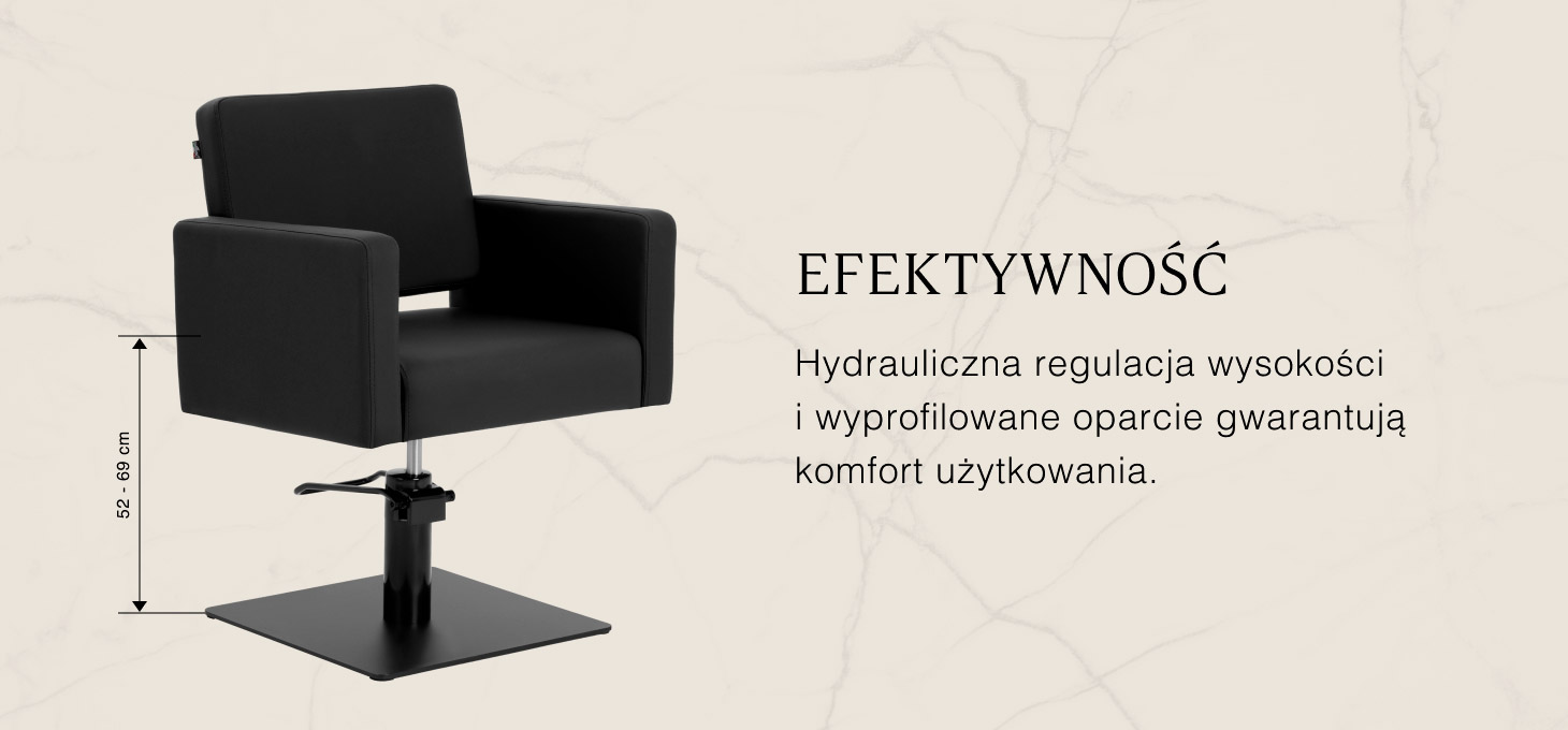 Trwały podnośnik hydrauliczny umożliwia płynną regulację wysokości siedziska w zakresie 52-69 cm, także w trakcie użytkowania fotela. Rozwiązanie to sprzyja ergonomii pracy, pozwalając na łatwe dopasowanie pozycji zarówno do wzrostu klienta, jak i fryzjera. Wyprofilowane oparcie zapewnia stabilne podparcie pleców i zajęcie wygodnej pozycji, co ma szczególne znaczenie podczas dłuższych zabiegów, realnie podnosząc komfort i satysfakcję klienta.
