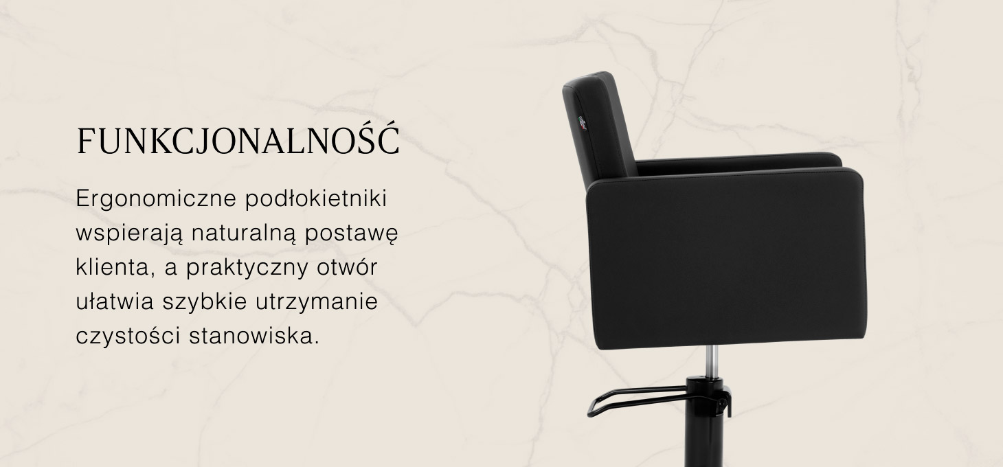 Przemyślana konstrukcja fotela zapewnia komfort nawet podczas dłuższych zabiegów. Odpowiednio wyprofilowane siedzisko oraz ergonomiczne podłokietniki wspierają naturalną postawę klienta, ułatwiając precyzyjną pracę fryzjera. Mechanizm pełnego obrotu zwiększa zakres ruchu i swobodę manewrowania, co przekłada się na płynność i efektywność wykonywanych usług. Praktyczny otwór między siedziskiem a oparciem umożliwia szybkie usuwanie włosów i sprawne utrzymanie stanowiska w czystości.