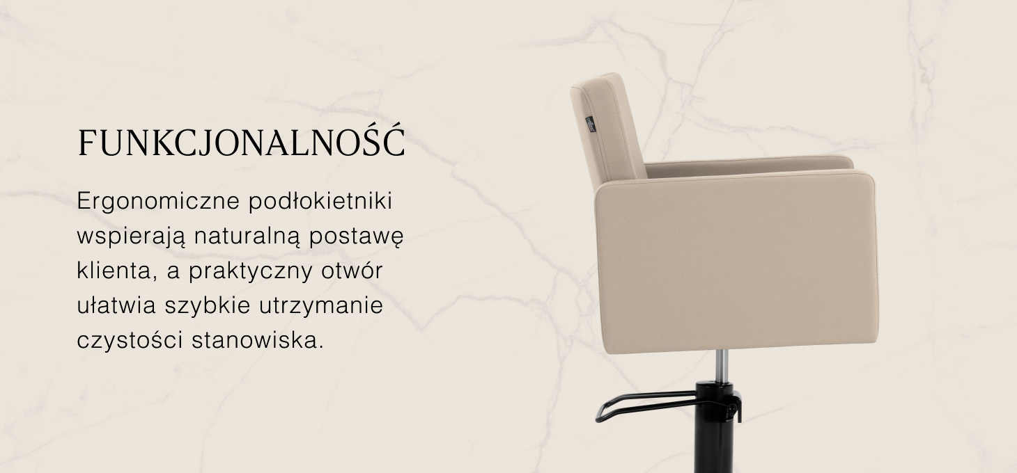 Przemyślana konstrukcja fotela zapewnia komfort nawet podczas dłuższych zabiegów. Odpowiednio wyprofilowane siedzisko oraz ergonomiczne podłokietniki wspierają naturalną postawę klienta, ułatwiając precyzyjną pracę fryzjera. Mechanizm pełnego obrotu zwiększa zakres ruchu i swobodę manewrowania, co przekłada się na płynność i efektywność wykonywanych usług. Praktyczny otwór między siedziskiem a oparciem umożliwia szybkie usuwanie włosów i sprawne utrzymanie stanowiska w czystości.