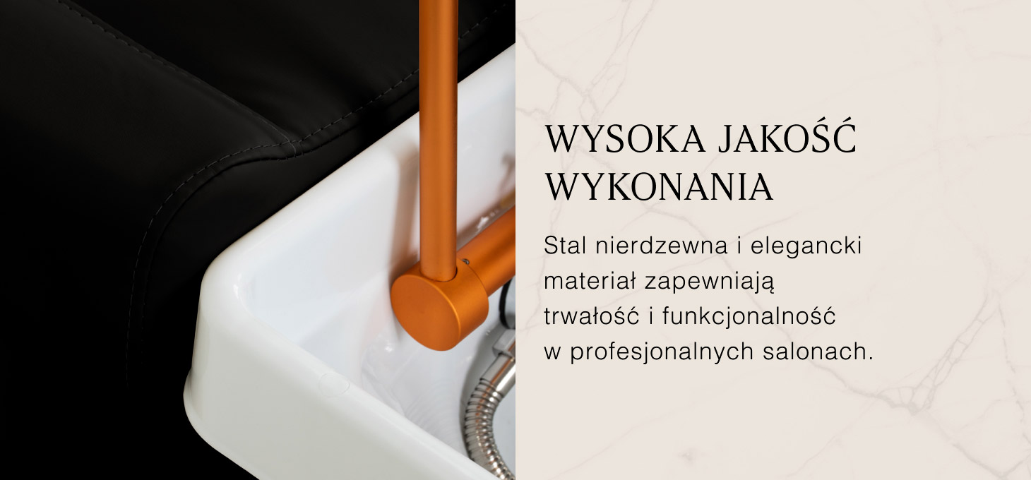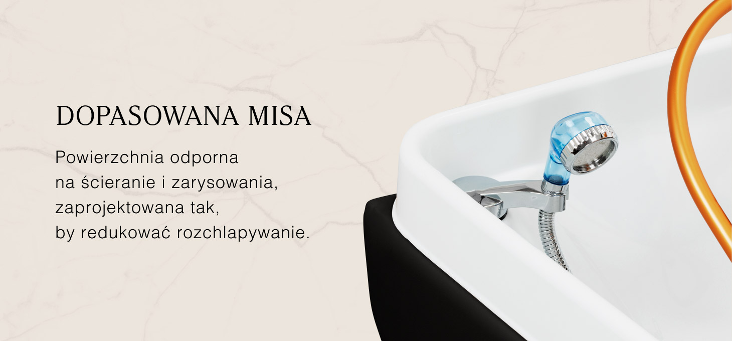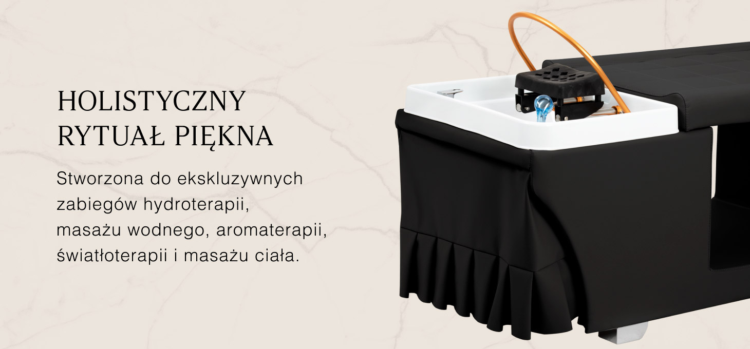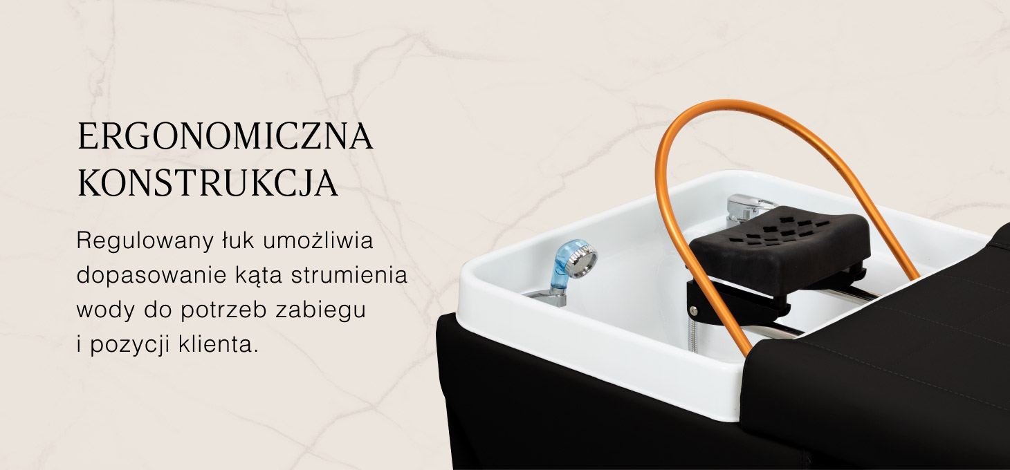 Myjnia została wyposażona w baterię z mieszaczem, umożliwiającą precyzyjne dopasowanie temperatury wody do potrzeb klienta. Dedykowane miejsce na słuchawkę natryskową usprawnia pracę, a chromowany korek ze specjalnym sitkiem zapewnia kontrolę przepływu wody i utrzymanie wysokiego poziomu higieny. Przyłącze wodne umieszczono wewnątrz podstawy za materiałem, co pozwala ukryć instalację i nadaje całości elegancki wygląd. Ergonomiczne wyprofilowanie leżanki gwarantuje komfort podczas różnych zabiegów pielęgnacyjnych. Całość dopełnia praktyczna pufa, zwiększająca wygodę pracy personelu i podnosząca funkcjonalność zestawu. Dzięki tym rozwiązaniom myjnia doskonale sprawdza się zarówno w salonach fryzjerskich, jak i gabinetach SPA.
