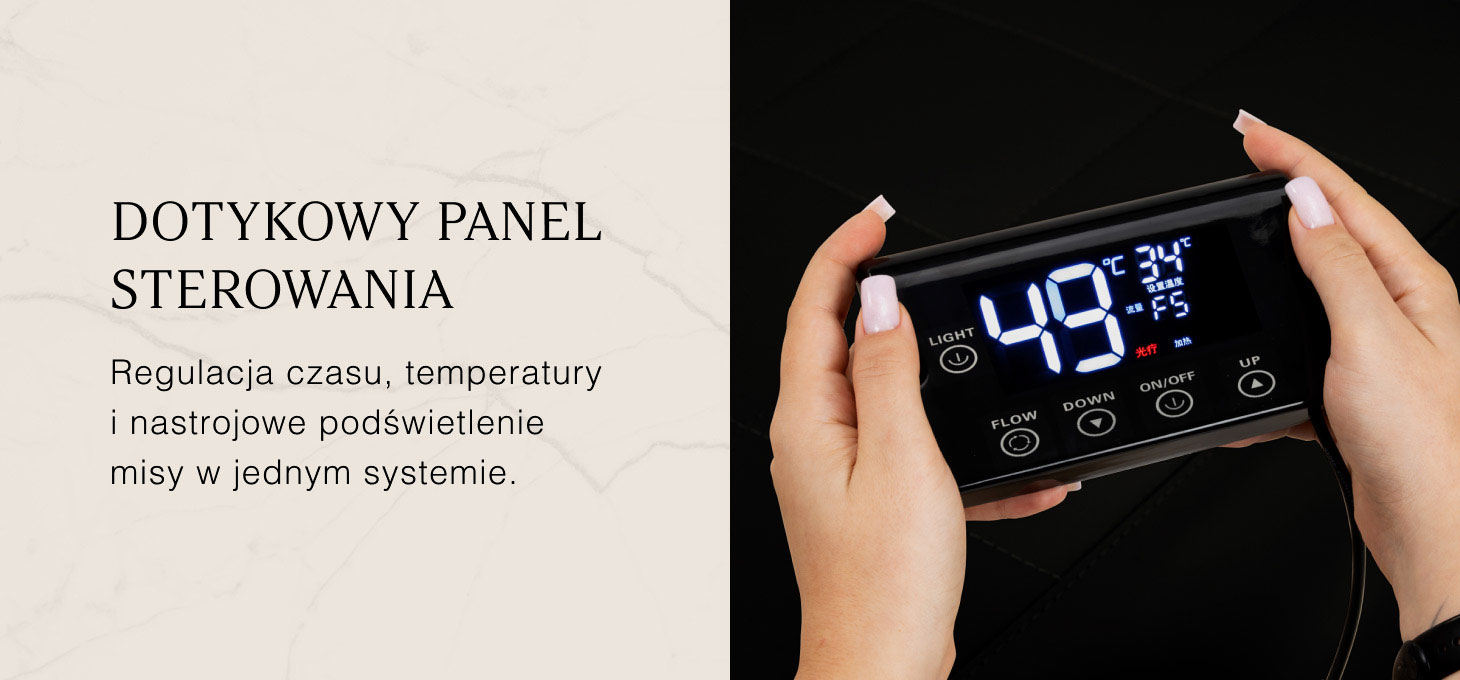 Intuicyjny panel dotykowy umożliwia pełną kontrolę nad parametrami zabiegu i wygodę obsługi. Umożliwia regulację temperatury wody, a także monitorowanie jej aktualnych wartości na wyraźnym, czytelnym wyświetlaczu. Dodatkowo panel pozwala uruchomić funkcję światłoterapii, czyli podświetlenia misy, które buduje atmosferę relaksu i luksusu. Zestaw uzupełnia pilot, umożliwiający wygodne sterowanie urządzeniem do terapii parowej na odległość.