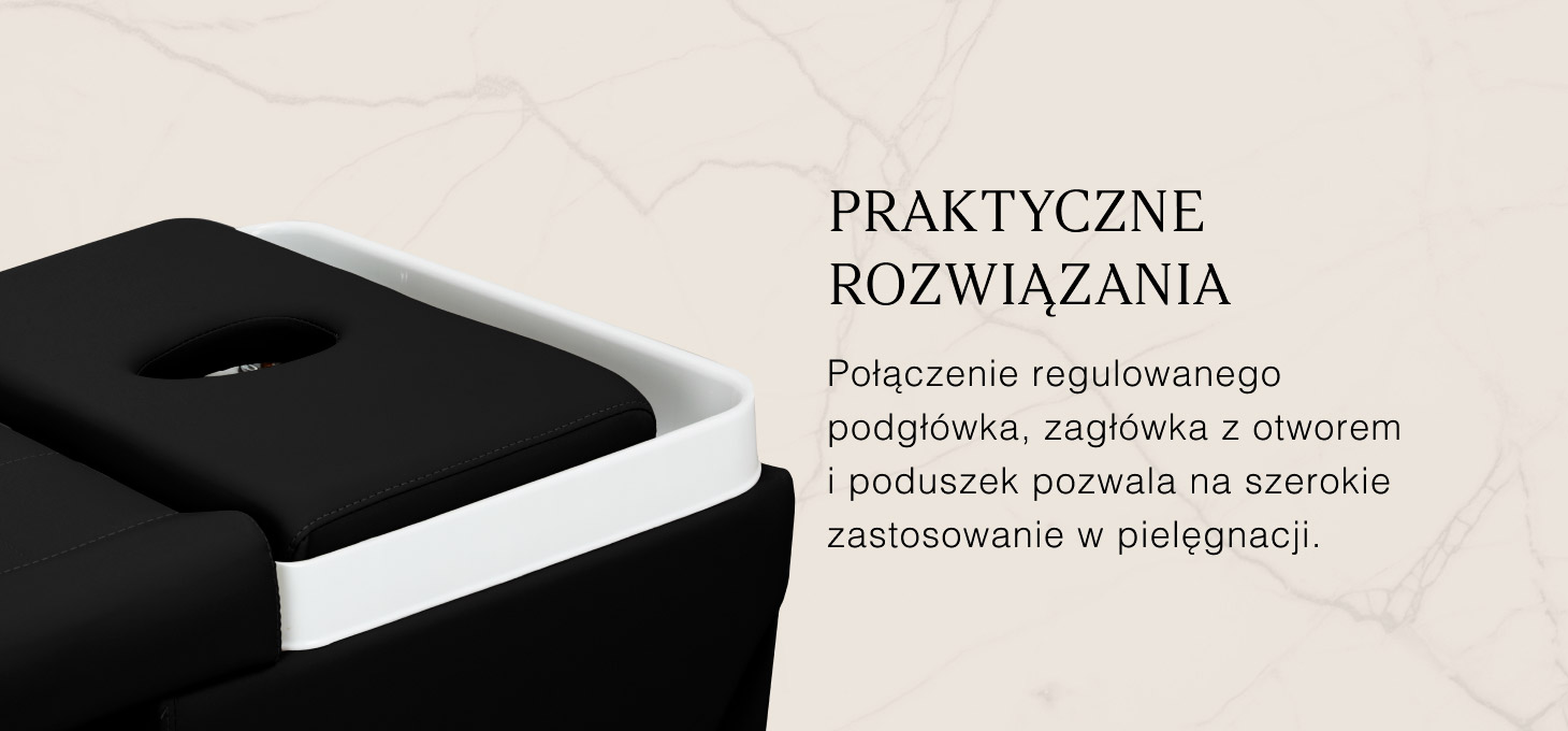 Regulowany podgłówek z możliwością wysuwania i zmiany kąta nachylenia pozwala na idealne dopasowanie do potrzeb użytkownika, zapewniając maksymalny komfort. W zestawie znajdują się również ergonomiczne poduszki, w tym zagłówek z otworem na twarz, który zwiększa możliwości zastosowania – od zabiegów pielęgnacyjnych skóry głowy, po masaże oraz różnorodne terapie na ciało i twarz. Dzięki takim praktycznym udogodnieniom leżanka staje się wszechstronnym elementem wyposażenia salonów beauty & wellness, łącząc wygodę klienta z funkcjonalnością potrzebną specjaliście.