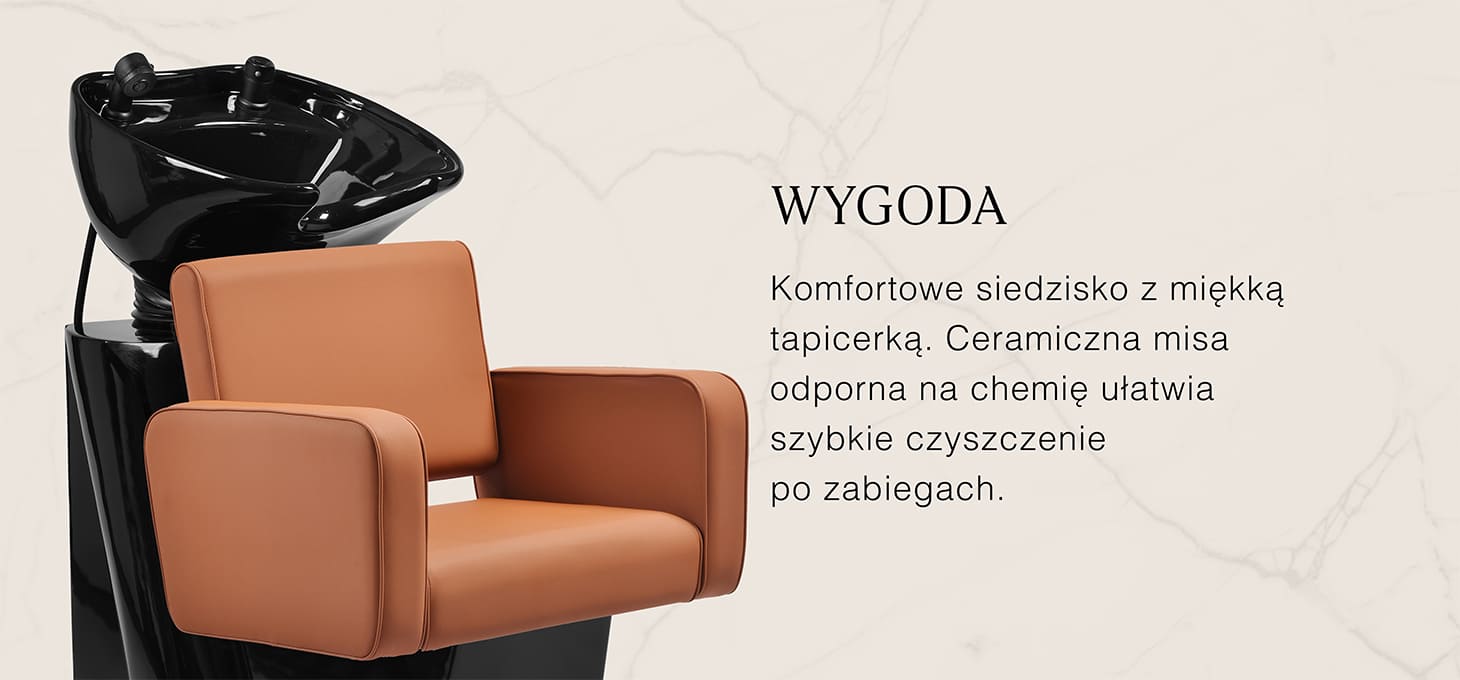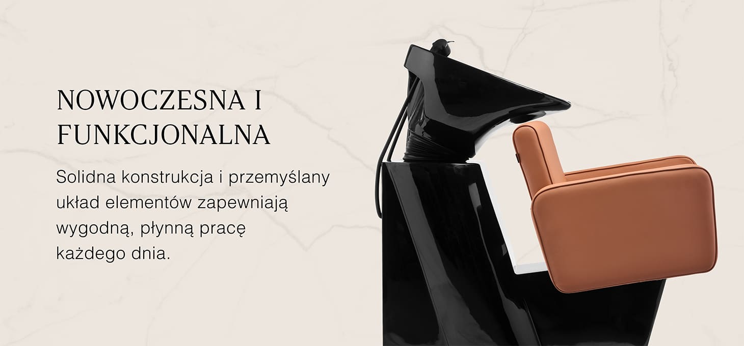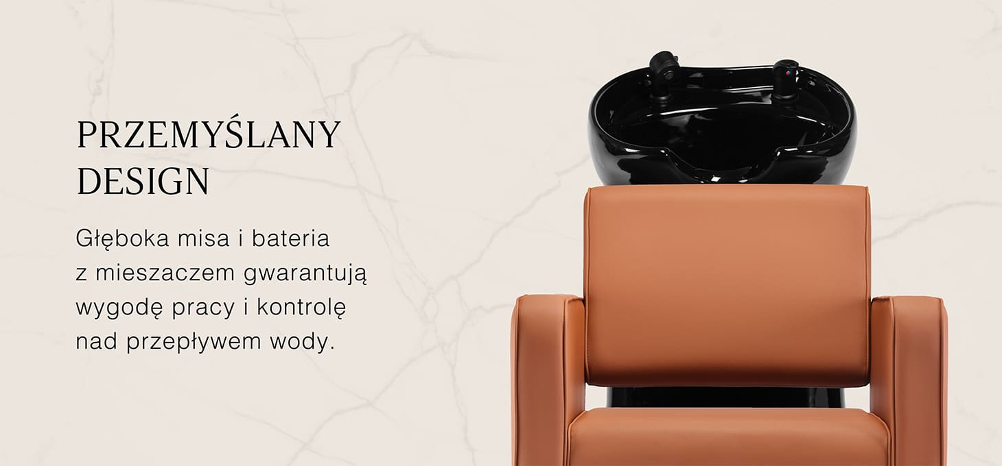 Głęboka ceramiczna misa w odcieniach czerni minimalizuje rozchlapywanie wody i kosmetyków podczas zabiegów. Regulowany kąt nachylenia misy umożliwia precyzyjne dopasowanie jej położenia do potrzeb klienta. Wykonana z trwałego materiału, jest odporna na przebarwienia, zarysowania i działanie środków chemicznych, a jej gładka powierzchnia ułatwia utrzymanie czystości. Ergonomicznie wyprofilowany kołnierz gwarantuje wygodne podparcie głowy, zapewnia wygodne podparcie głowy, natomiast czarna nakładka z tworzywa sztucznego eliminuje uczucie chłodu przy kontakcie z ceramiką.
