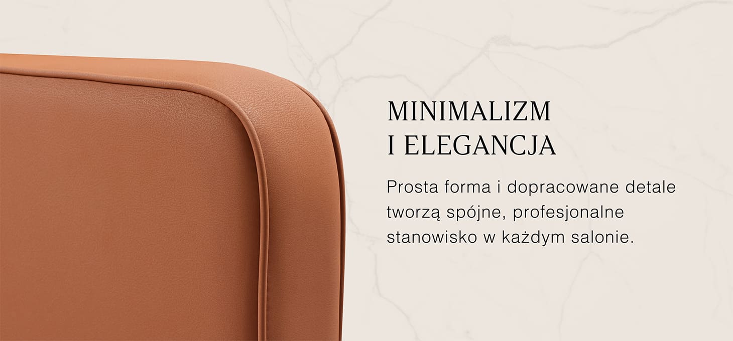 Fotel o geometrycznej formie z miękko zaokrąglonymi krawędziami łączy prostotę i wygodę w nowoczesnym wydaniu. Kwadratowe siedzisko i podłokietniki o łagodnych kątach tworzą harmonijną całość, gwarantując komfortową pozycję podczas zabiegów. Oparcie o optymalnym kącie nachylenia wspiera prawidłową postawę, pozwalając na pełen relaks. Tapicerka z wysokiej jakości skóry syntetycznej w odcieniach brązu jest odporna na zużycie i łatwa do utrzymania w czystości. Geometryczna, nowoczesna forma mebla podkreśla elegancki charakter myjni oraz spójnie komponuje się z aranżacją salonu. W zestawie znajduje się kompletna armatura o matowym wykończeniu w odcieniach czerni, w tym bateria, słuchawka prysznicowa oraz dedykowane węże, aby zapewnić całkowity zestaw narzędzi do pracy.