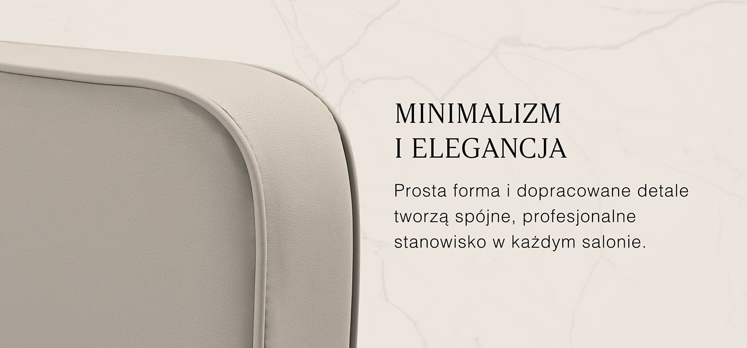 Fotel o geometrycznej formie z miękko zaokrąglonymi krawędziami łączy prostotę i wygodę w nowoczesnym wydaniu. Kwadratowe siedzisko i podłokietniki o łagodnych kątach tworzą harmonijną całość, gwarantując komfortową pozycję podczas zabiegów. Oparcie o optymalnym kącie nachylenia wspiera prawidłową postawę, pozwalając na pełen relaks. Tapicerka z wysokiej jakości skóry syntetycznej w odcieniach szarości i beżu jest odporna na zużycie i łatwa do utrzymania w czystości. Geometryczna, nowoczesna forma mebla podkreśla elegancki charakter myjni oraz spójnie komponuje się z aranżacją salonu. W zestawie znajduje się kompletna armatura o matowym wykończeniu w odcieniach czerni, w tym bateria, słuchawka prysznicowa oraz dedykowane węże, aby zapewnić całkowity zestaw narzędzi do pracy.