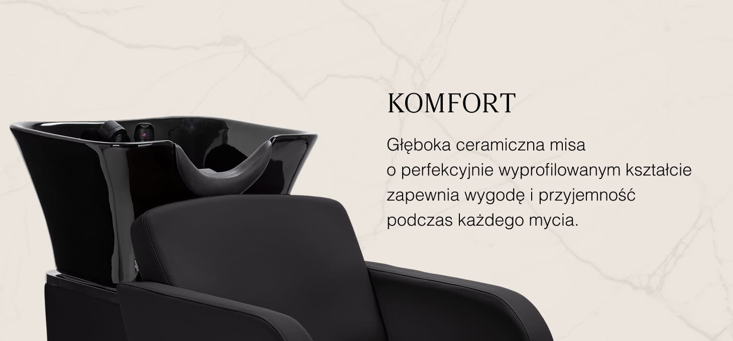 Ceramiczna misa umywalki w odcieniach czerni, o nowoczesnym kształcie i odpowiedniej głębokości, skutecznie zapobiega rozchlapywaniu wody oraz produktów używanych podczas zabiegów, umożliwiając komfortowe i efektywne wykonywanie szerokiej gamy usług. Odpowiednio wyprofilowany kołnierz oraz nachylone oparcie zapewniają wygodę i wsparcie podczas mycia włosów, a nakładka z tworzywa sztucznego w odcieniach czerni chroni klienta przed chłodem ceramicznej powierzchni, gwarantując przyjemne doznania w trakcie zabiegu.