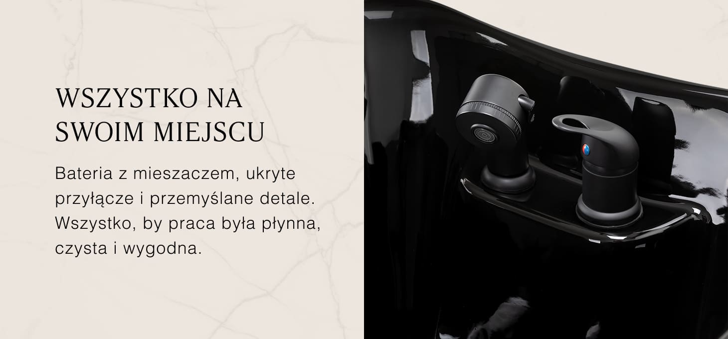 Myjnia wyposażona w baterię z mieszaczem, która umożliwia łatwy dostęp do ciepłej i zimnej wody, pozwalając na precyzyjne dopasowanie temperatury do indywidualnych preferencji klienta. Praktyczne miejsce na odłożenie słuchawki ułatwia pracę, a korek ze specjalnym sitkiem pozwala kontrolować przepływ wody i utrzymywać wysokie standardy higieny w salonie. Przyłącze wody umieszczono wewnątrz podstawy, dzięki czemu instalacja pozostaje dyskretnie ukryta, co wpływa na estetykę i porządek stanowiska pracy. Ergonomiczny kształt myjni zapewnia wygodę podczas wykonywania różnorodnych zabiegów, a przemyślane połączenie funkcjonalności i detali sprawia, że codzienna praca w salonie staje się jeszcze bardziej komfortowa.