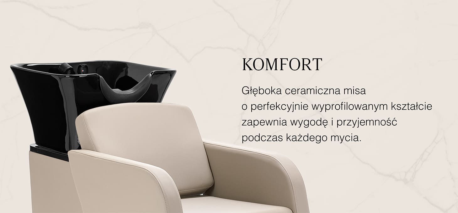 Ceramiczna misa umywalki w odcieniach czerni, o nowoczesnym kształcie i odpowiedniej głębokości, skutecznie zapobiega rozchlapywaniu wody oraz produktów używanych podczas zabiegów, umożliwiając komfortowe i efektywne wykonywanie szerokiej gamy usług. Odpowiednio wyprofilowany kołnierz oraz nachylone oparcie zapewniają wygodę i wsparcie podczas mycia włosów, a nakładka z tworzywa sztucznego w odcieniach czerni chroni klienta przed chłodem ceramicznej powierzchni, gwarantując przyjemne doznania w trakcie zabiegu.