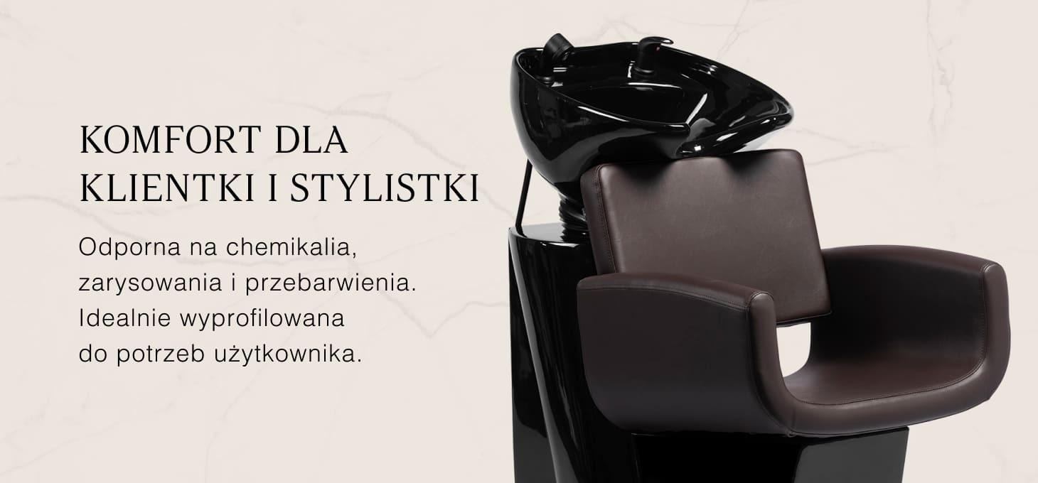 Głęboka, ceramiczna misa w odcieniach czerni ogranicza rozchlapywanie wody oraz kosmetyków używanych podczas zabiegów. Regulowany kąt nachylenia umożliwia dopasowanie jej położenia do indywidualnych potrzeb. Trwały materiał zapewnia odporność na przebarwienia, zarysowania i działanie środków chemicznych, a gładka powierzchnia ułatwia utrzymanie w czystości. Ergonomicznie wyprofilowany kołnierz gwarantuje wygodne podparcie głowy.