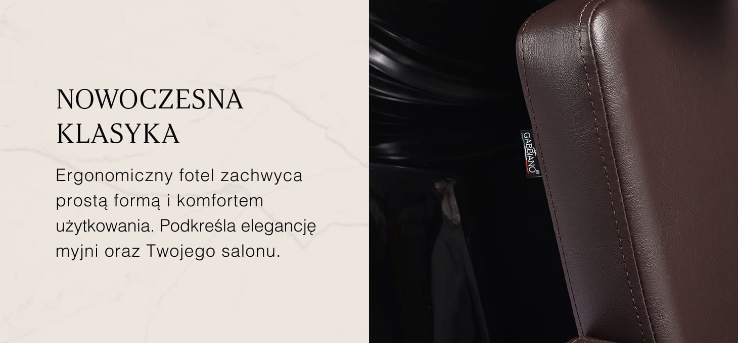 Minimalistyczny fotel o charakterystycznie zaokrąglonym siedzisku łączy prostotę formy z wysokim komfortem użytkowania. Oparcie o optymalnym kącie nachylenia wspiera naturalną pozycję ciała. Tapicerka wykonana z wysokiej jakości skóry syntetycznej w odcieniach brązu jest odporna na zużycie i łatwa do utrzymania w czystości. Nowoczesna linia mebla podkreśla elegancki charakter myjni oraz doskonale komponuje się z wystrojem salonu. W zestawie znajduje się kompletna armatura o matowym wykończeniu w odcieniach czerni, w tym bateria, słuchawka prysznicowa oraz dedykowane węże, aby zapewnić całkowity zestaw narzędzi do pracy.