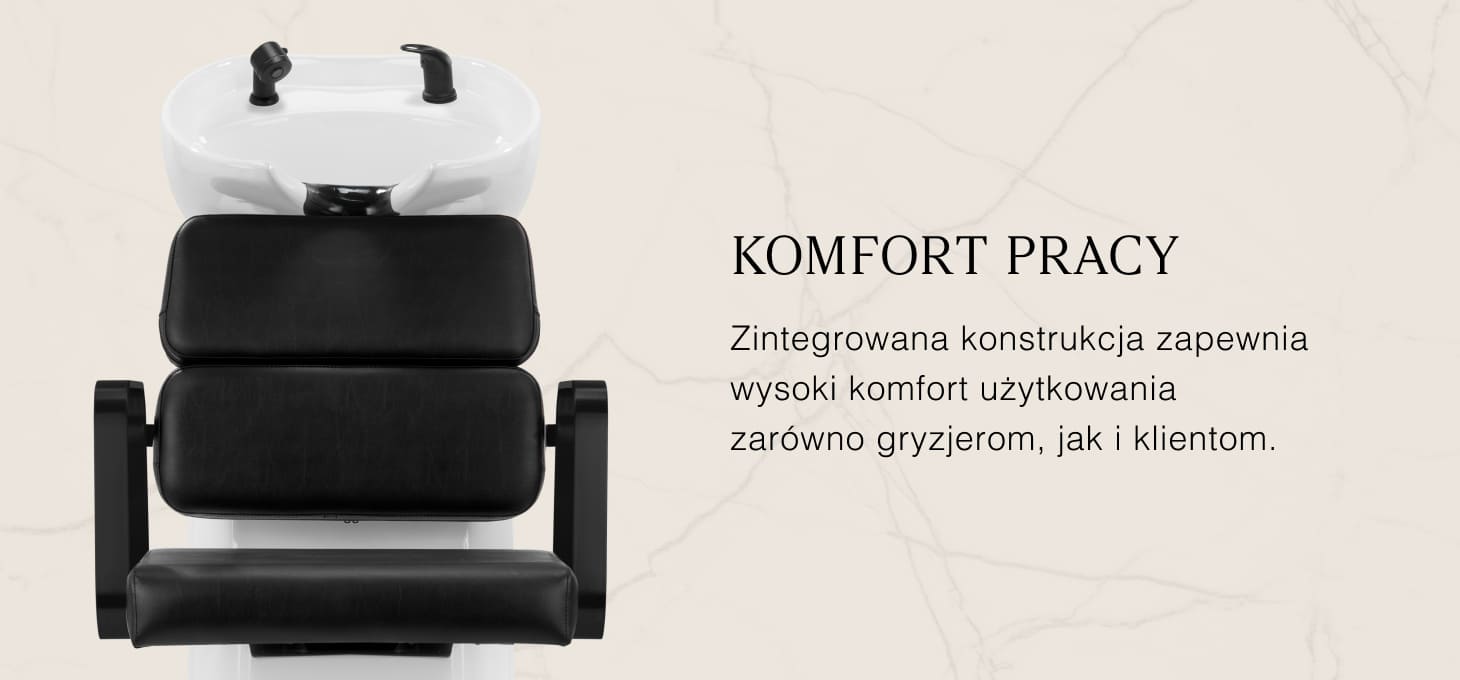 Wyprofilowany fotel zapewnia odpowiednie wsparcie lędźwi, a co za tym idzie wysoki komfort użytkowania. Metalowe podłokietniki w odcieniach czerni o geometrycznym kształcie pozwalają na prawidłowe ułożenie barków klienta. Wypełnienie z trwałej, odpornej na odkształcenia pianki oraz obicie wykonane z przyjemnej w dotyku skóry syntetycznej w odcieniach czerni zapewniają trwałość mebla, łatwość czyszczenia i komfortowe użytkowanie przez długi czas. Oryginalny, elegancki wygląd myjni nadaje wnętrzom niepowtarzalnego wyrazu. W zestawie znajduje się kompletna armatura w odcieniach czerni, w tym bateria, słuchawka prysznicowa oraz dedykowane węże, aby zapewnić kompletny zestaw narzędzi do pracy.