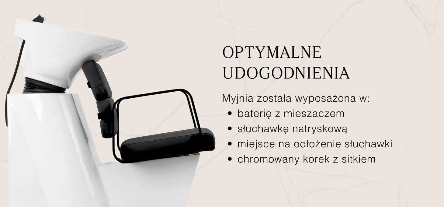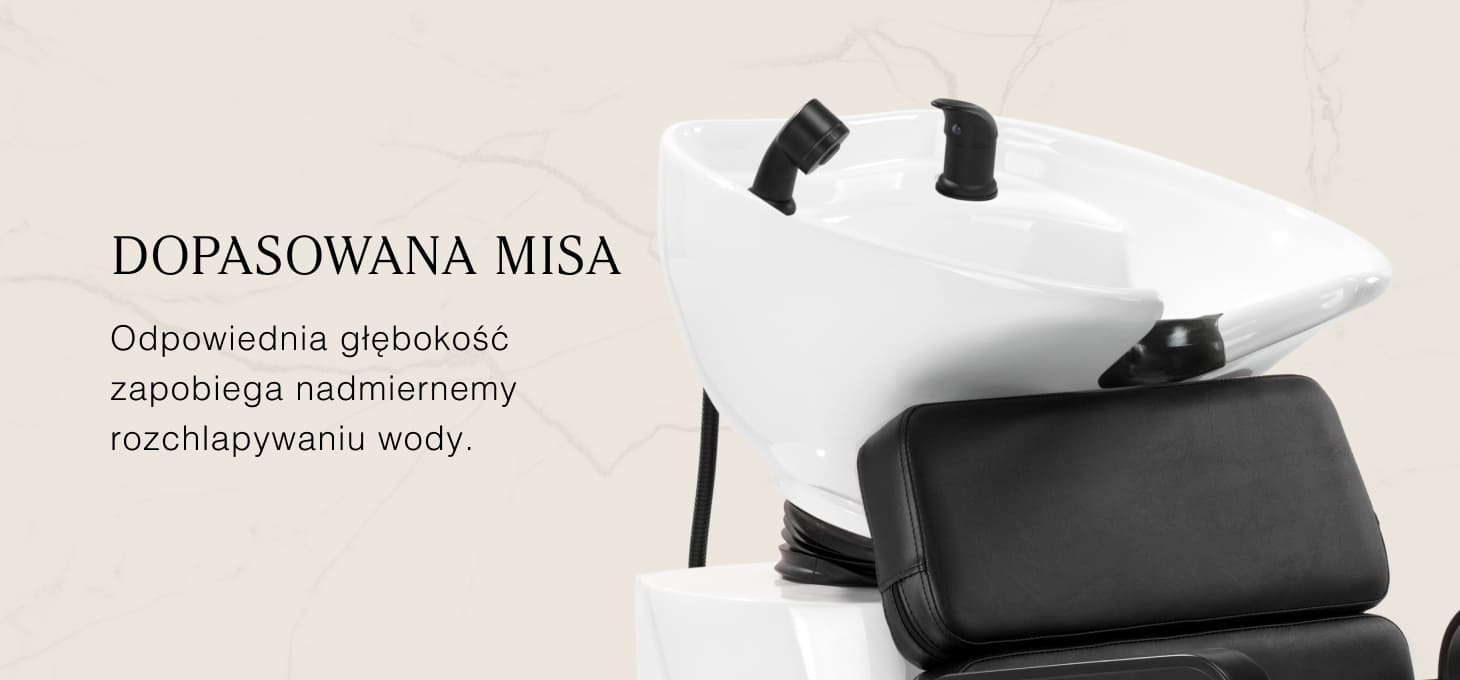 Praktyczna myjnia wyposażona została w baterię z mieszaczem, co zapewnia swobodny dostęp do ciepłej oraz zimnej wody. Ułatwia to dopasowanie temperatury do indywidualnych preferencji klienta. Dedykowane miejsce na odłożenie słuchawki usprawnia pracę, a chromowany korek ze specjalnym sitkiem pozwala na kontrolę przepływu wody oraz utrzymanie wysokich standardów higieny w salonie. Przyłącze wody zostało umieszczone wewnątrz podstawy, umożliwiając sprawne ukrywanie rur. Znacznym plusem tego modelu jest otwór pozostawiony pomiędzy oparciem a siedziskiem, który ułatwia zachowanie czystości w salonie, pozwalając w łatwy sposób wymieść zabrudzenia z każdego zakamarka fotela. Myjnia wyprofilowana została w taki sposób, by zapewniać wygodę podczas wykonywania różnorodnych zabiegów, gwarantując odpowiednie wsparcie pleców. Połączenie funkcjonalności i udogodnień sprawia, że praca w salonie fryzjerskim jest jeszcze bardziej komfortowa.