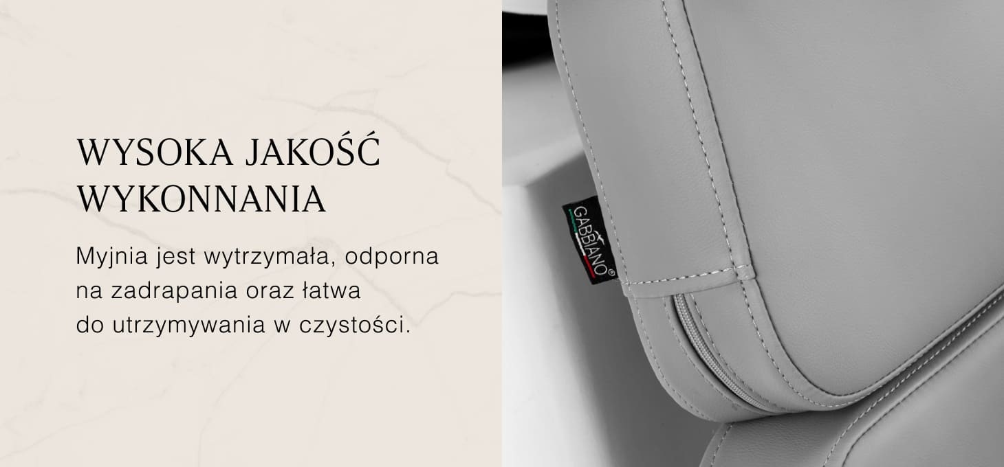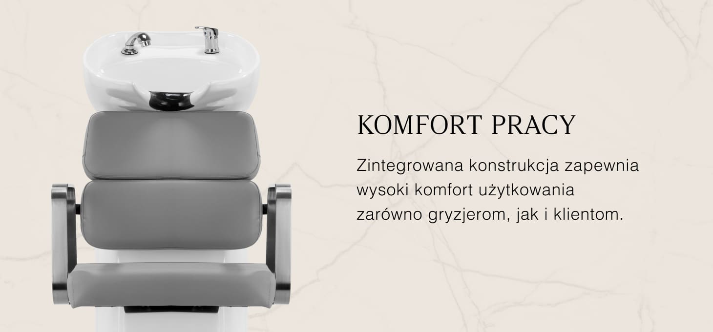Wyprofilowany fotel zapewnia odpowiednie wsparcie lędźwi, a co za tym idzie wysoki komfort użytkowania. Metalowe podłokietniki w odcieniach chromu o geometrycznym kształcie pozwalają na prawidłowe ułożenie barków klienta. Wypełnienie z trwałej, odpornej na odkształcenia pianki oraz obicie wykonane z przyjemnej w dotyku skóry syntetycznej w odcieniach szarości zapewniają trwałość mebla, łatwość czyszczenia i komfortowe użytkowanie przez długi czas. Oryginalny, elegancki wygląd myjni nadaje wnętrzom niepowtarzalnego wyrazu. W zestawie znajduje się kompletna armatura w odcieniach chromu, w tym bateria, słuchawka prysznicowa oraz dedykowane węże, aby zapewnić kompletny zestaw narzędzi do pracy.