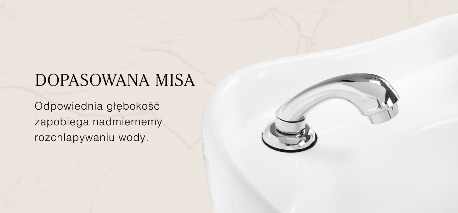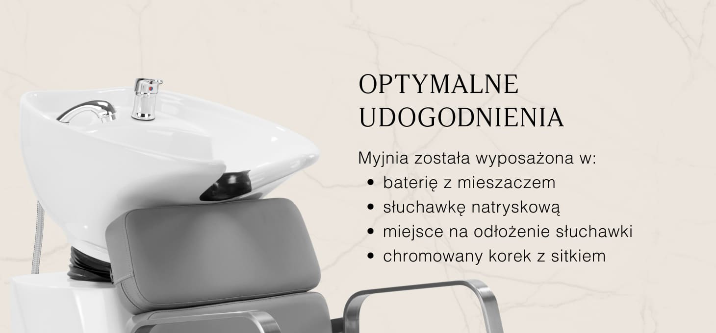 Praktyczna myjnia wyposażona została w baterię z mieszaczem, co zapewnia swobodny dostęp do ciepłej oraz zimnej wody. Ułatwia to dopasowanie temperatury do indywidualnych preferencji klienta. Dedykowane miejsce na odłożenie słuchawki usprawnia pracę, a chromowany korek ze specjalnym sitkiem pozwala na kontrolę przepływu wody oraz utrzymanie wysokich standardów higieny w salonie. Przyłącze wody zostało umieszczone wewnątrz podstawy, umożliwiając sprawne ukrywanie rur. Znacznym plusem tego modelu jest otwór pozostawiony pomiędzy oparciem a siedziskiem, który ułatwia zachowanie czystości w salonie, pozwalając w łatwy sposób wymieść zabrudzenia z każdego zakamarka fotela. Myjnia wyprofilowana została w taki sposób, by zapewniać wygodę podczas wykonywania różnorodnych zabiegów, gwarantując odpowiednie wsparcie pleców. Połączenie funkcjonalności i udogodnień sprawia, że praca w salonie fryzjerskim jest jeszcze bardziej komfortowa.