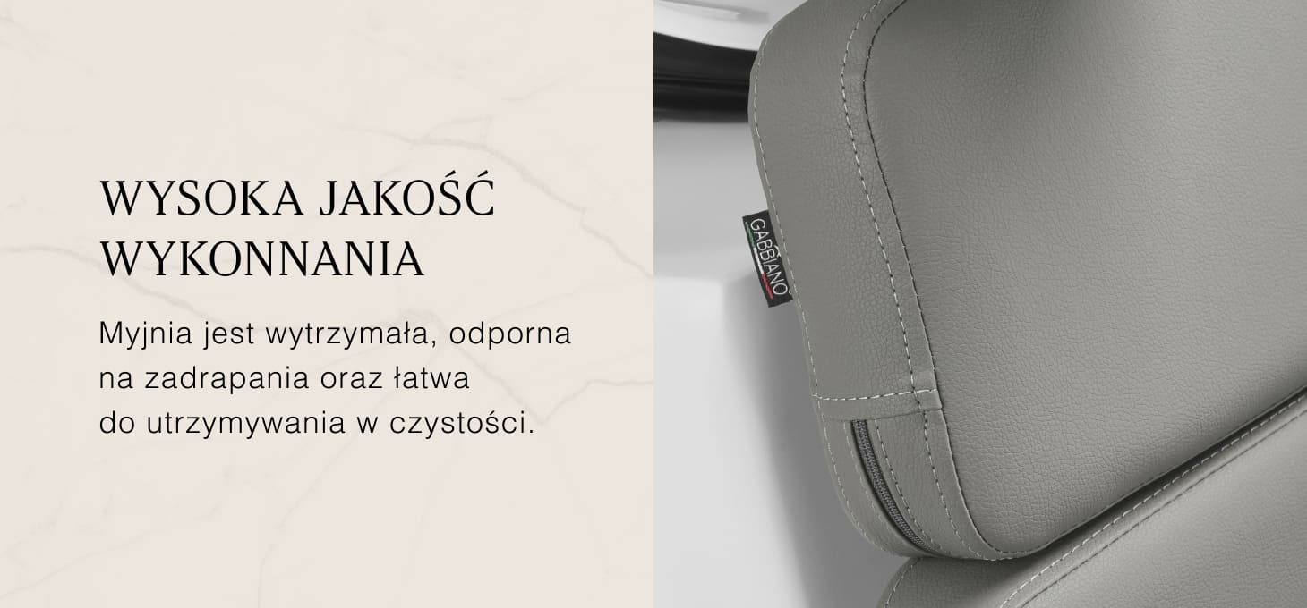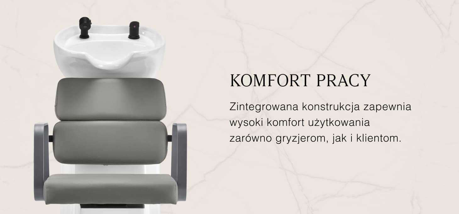 Wyprofilowany fotel zapewnia odpowiednie wsparcie lędźwi, a co za tym idzie wysoki komfort użytkowania. Metalowe podłokietniki w odcieniach szarości o geometrycznym kształcie pozwalają na prawidłowe ułożenie barków klienta. Wypełnienie z trwałej, odpornej na odkształcenia pianki oraz obicie wykonane z przyjemnej w dotyku skóry syntetycznej w odcieniach szarości zapewniają trwałość mebla, łatwość czyszczenia i komfortowe użytkowanie przez długi czas. Oryginalny, elegancki wygląd myjni nadaje wnętrzom niepowtarzalnego wyrazu. W zestawie znajduje się kompletna armatura w odcieniach czerni, w tym bateria, słuchawka prysznicowa oraz dedykowane węże, aby zapewnić kompletny zestaw narzędzi do pracy.