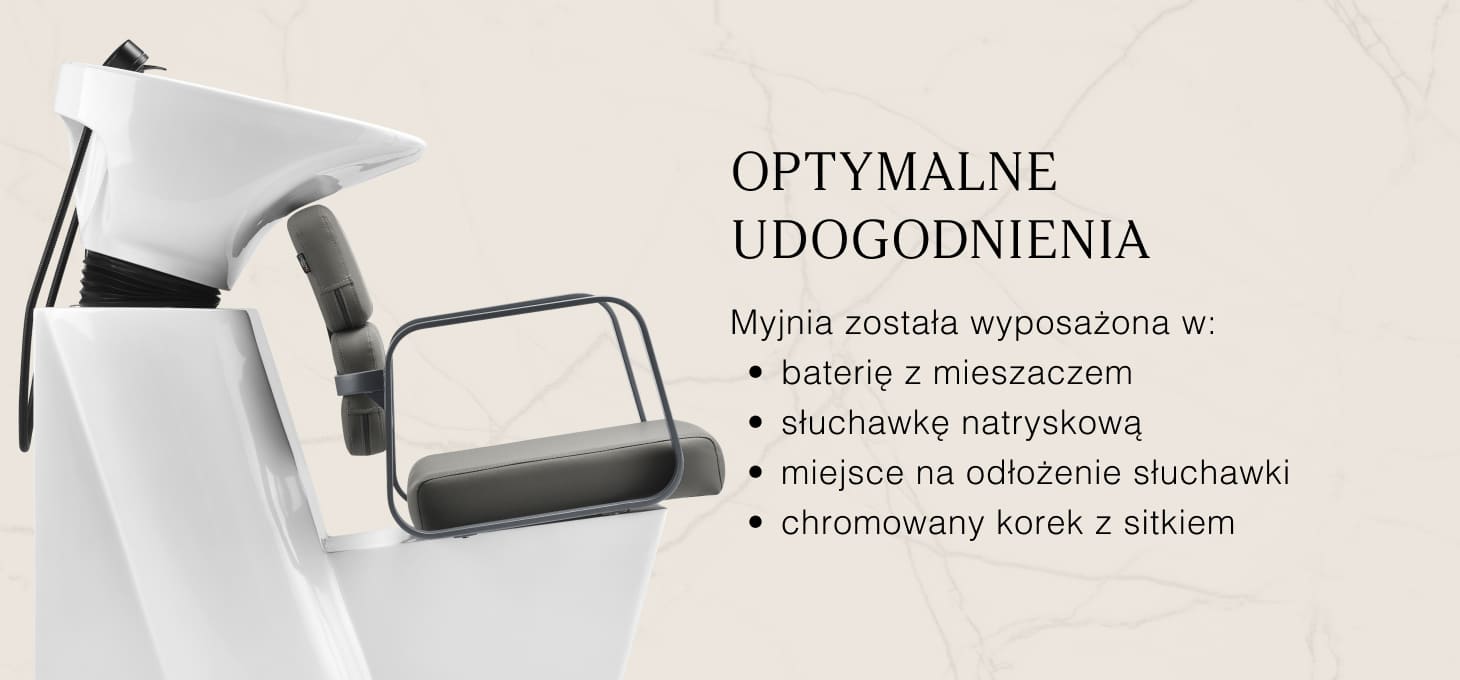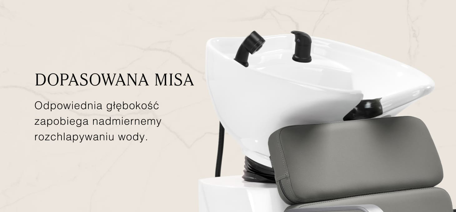 Praktyczna myjnia wyposażona została w baterię z mieszaczem, co zapewnia swobodny dostęp do ciepłej oraz zimnej wody. Ułatwia to dopasowanie temperatury do indywidualnych preferencji klienta. Dedykowane miejsce na odłożenie słuchawki usprawnia pracę, a chromowany korek ze specjalnym sitkiem pozwala na kontrolę przepływu wody oraz utrzymanie wysokich standardów higieny w salonie. Przyłącze wody zostało umieszczone wewnątrz podstawy, umożliwiając sprawne ukrywanie rur. Znacznym plusem tego modelu jest otwór pozostawiony pomiędzy oparciem a siedziskiem, który ułatwia zachowanie czystości w salonie, pozwalając w łatwy sposób wymieść zabrudzenia z każdego zakamarka fotela. Myjnia wyprofilowana została w taki sposób, by zapewniać wygodę podczas wykonywania różnorodnych zabiegów, gwarantując odpowiednie wsparcie pleców. Połączenie funkcjonalności i udogodnień sprawia, że praca w salonie fryzjerskim jest jeszcze bardziej komfortowa.