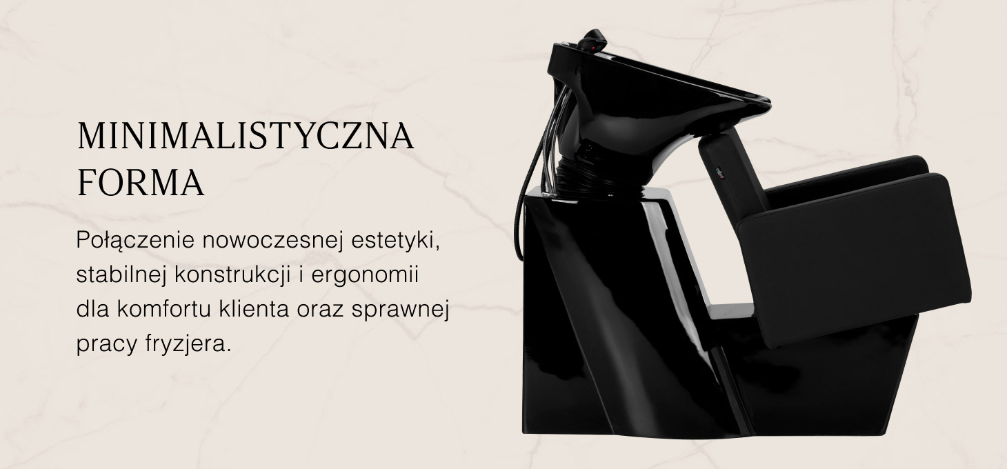 Fotel o geometrycznej formie łączy nowoczesną prostotę z wygodą użytkowania. Siedzisko i podłokietniki o łagodnych kątach tworzą harmonijną całość, zapewniając komfortową pozycję podczas zabiegów, a oparcie o optymalnym kącie nachylenia wspiera prawidłową postawę i odprężenie. Tapicerka z wysokiej jakości skóry syntetycznej w odcieniach czerni jest odporna na zużycie i wilgoć, a przy tym łatwa do utrzymania w czystości. Prosta, nowoczesna forma mebla podkreśla elegancki charakter myjni, a kompletna armatura – bateria, słuchawka prysznicowa i dedykowane węże – zapewnia pełny zestaw narzędzi do pracy.