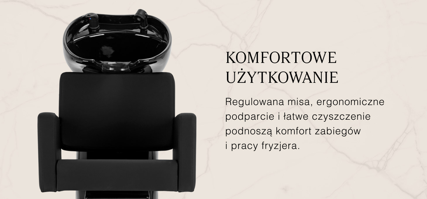Głęboka ceramiczna misa w odcieniach czerni minimalizuje rozchlapywanie wody i kosmetyków podczas zabiegów. Regulowany kąt nachylenia misy umożliwia precyzyjne dopasowanie jej położenia do potrzeb klienta. Wykonana z trwałego materiału, jest odporna na przebarwienia, zarysowania i działanie środków chemicznych, a gładka powierzchnia ułatwia utrzymanie czystości. Ergonomicznie wyprofilowany kołnierz zapewnia wygodne podparcie głowy, a czarna nakładka z tworzywa sztucznego eliminuje uczucie chłodu przy kontakcie z ceramiką.