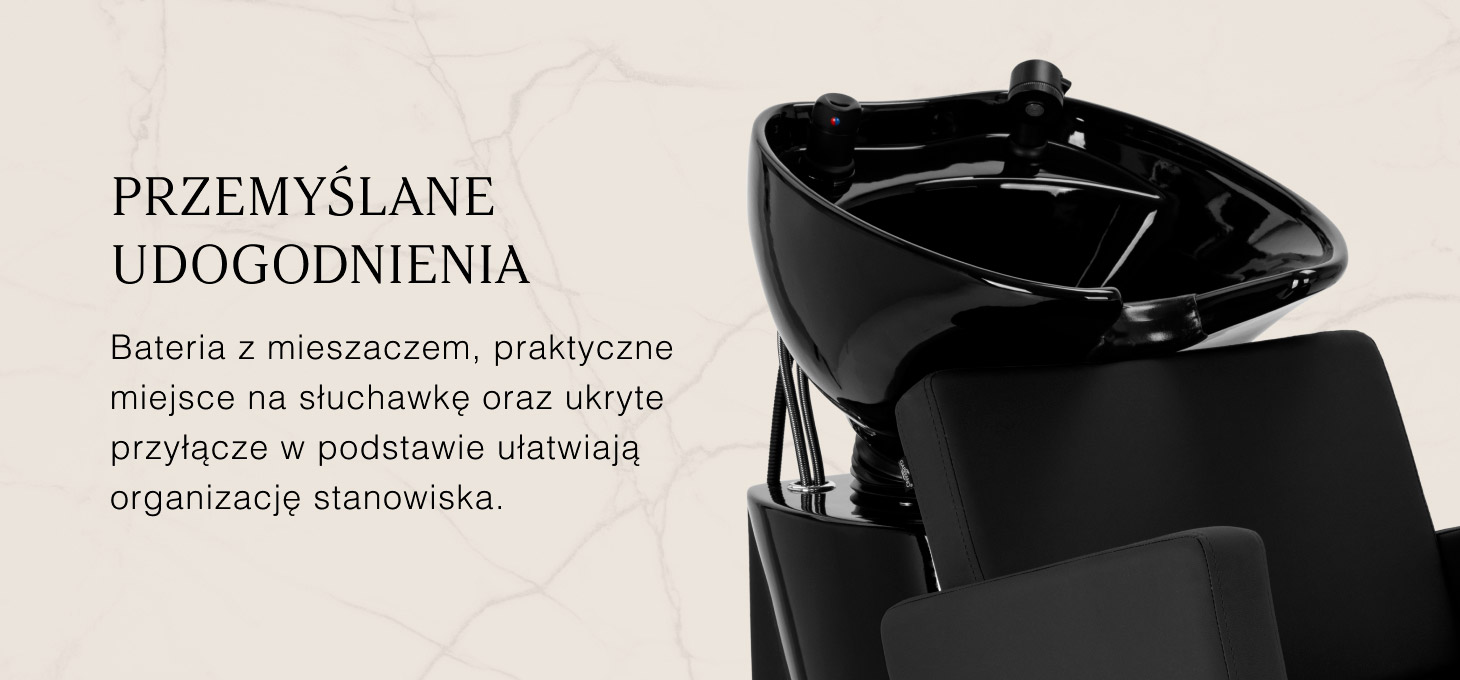 Myjnia wyposażona jest w baterię z mieszaczem, zapewniającą stały dostęp do ciepłej i zimnej wody oraz możliwość łatwego dopasowania temperatury do potrzeb klienta. Praktyczne miejsce na słuchawkę natryskową ułatwia organizację stanowiska, a korek ze specjalnym sitkiem pozwala kontrolować przepływ wody i utrzymywać wysoki poziom higieny. Przyłącze wody zostało umieszczone wewnątrz podstawy, co pozwala estetycznie ukryć instalację. Połączenie funkcjonalnych rozwiązań z ergonomicznymi detalami sprawia, że codzienna praca przebiega sprawnie i wygodnie.