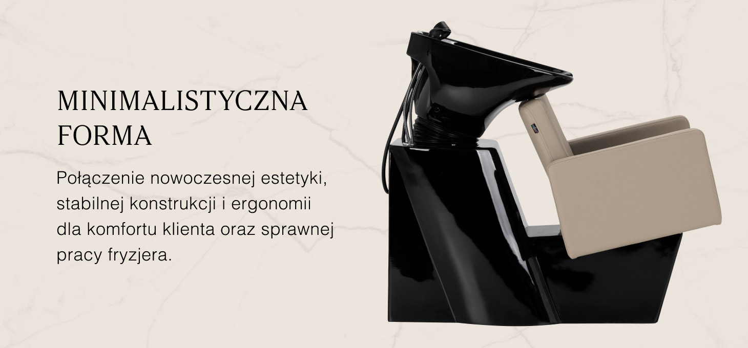 Fotel o geometrycznej formie łączy nowoczesną prostotę z wygodą użytkowania. Siedzisko i podłokietniki o łagodnych kątach tworzą harmonijną całość, zapewniając komfortową pozycję podczas zabiegów, a oparcie o optymalnym kącie nachylenia wspiera prawidłową postawę i odprężenie. Tapicerka z wysokiej jakości skóry syntetycznej w odcieniach czerni jest odporna na zużycie i wilgoć, a przy tym łatwa do utrzymania w czystości. Prosta, nowoczesna forma mebla podkreśla elegancki charakter myjni, a kompletna armatura – bateria, słuchawka prysznicowa i dedykowane węże – zapewnia pełny zestaw narzędzi do pracy.