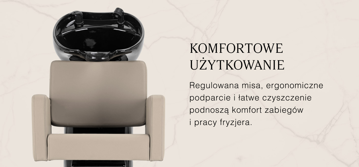 Głęboka ceramiczna misa w odcieniach czerni minimalizuje rozchlapywanie wody i kosmetyków podczas zabiegów. Regulowany kąt nachylenia misy umożliwia precyzyjne dopasowanie jej położenia do potrzeb klienta. Wykonana z trwałego materiału, jest odporna na przebarwienia, zarysowania i działanie środków chemicznych, a gładka powierzchnia ułatwia utrzymanie czystości. Ergonomicznie wyprofilowany kołnierz zapewnia wygodne podparcie głowy, a czarna nakładka z tworzywa sztucznego eliminuje uczucie chłodu przy kontakcie z ceramiką.
