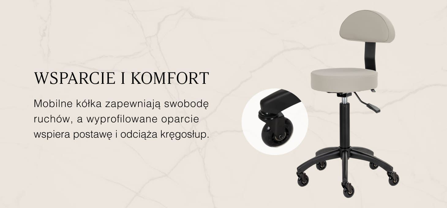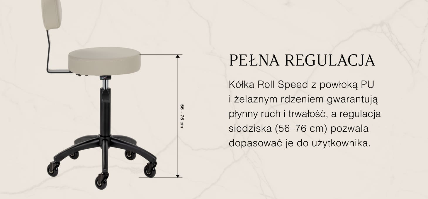 Regulacja wysokości siedziska w zakresie 56-76 cm umożliwia dopasowanie pozycji do indywidualnych potrzeb specjalisty podczas wykonywania usług. Oparcie wspiera kręgosłup, zapewniając komfort nawet w trakcie długotrwałej pracy. Mechanizm pełnego obrotu zwiększa swobodę ruchów, co przekłada się na większą wygodę i efektywność pracy. Mobilność zapewniają kółka Roll Speed z żelaznym rdzeniem i powłoką z poliuretanu (PU), które łączą płynność ruchu z wyjątkową odpornością na zużycie. Zastosowanie łożysk klasy ABEC-7 sprawia, że taboret porusza się łatwo, co znacząco ułatwia manewrowanie.