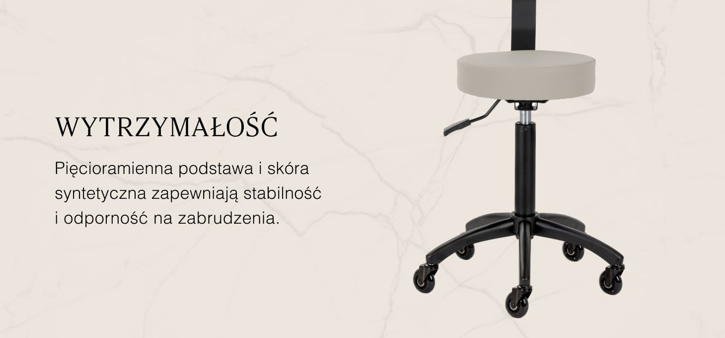 Taboret osadzono na pięcioramiennej, czarnej podstawie z półmatowym wykończeniem, co zapewnia doskonałą stabilność nawet przy intensywnym użytkowaniu. Siedzisko obito wytrzymałą skórą syntetyczną w odcieniach szarości i beżu, odporną na wilgoć, zabrudzenia i codzienną eksploatację, a piankowe wypełnienie utrzymuje swój kształt nawet przy długotrwałym obciążeniu. Nowoczesny, estetyczny wygląd sprawia, że taboret doskonale wpisuje się w profesjonalne wnętrza. To praktyczny i elegancki wybór dla salonów fryzjerskich, kosmetycznych i gabinetów, w których istotne są komfort pracy, solidność wykonania oraz stylowe wyposażenie.