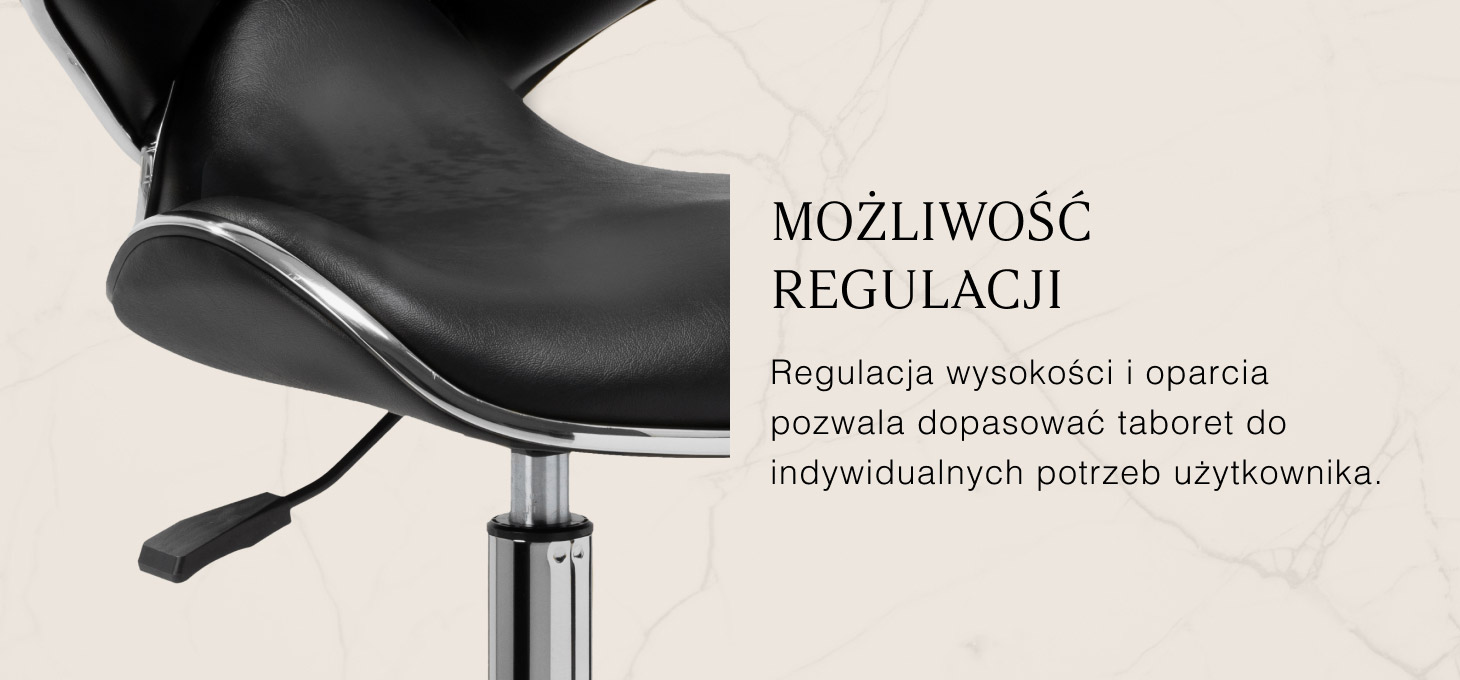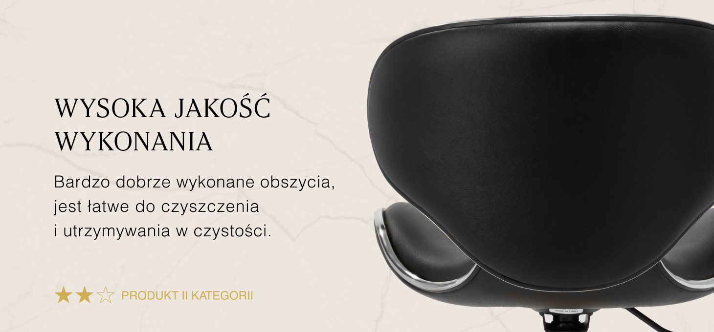 Pięcioramienna podstawa zapewnia stabilność, nawet podczas bardziej dynamicznych ruchów czy częstych zmian pozycji. Wyposażenie w wytrzymałe koła zapewnia wysoką mobilność, co pozwala na swobodne przemieszczanie się po salonie czy gabinecie. Obicie ze skóry syntetycznej w odcieniach czerni, które jest nie tylko trwałe, ale także łatwe do utrzymania w czystości. Estetyczne elementy w odcieniach chromu dodają luksusowego charakteru i przyciągają wzrok. Wyjątkowe połączenie elegancji oraz komfortu czyni taboret niezastąpionym narzędziem w pracy każdego profesjonalisty.