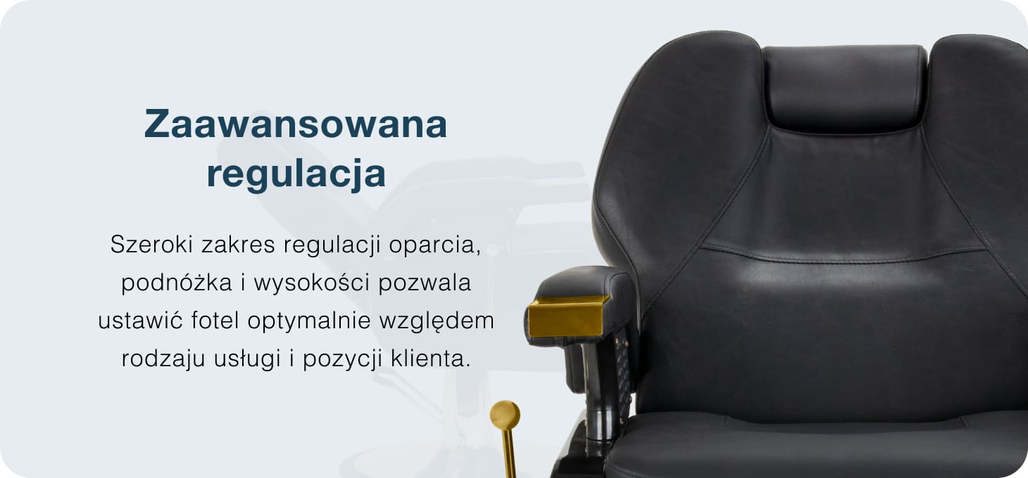 Stabilna, okrągła podstawa w złotym wykończeniu nadaje fotelowi efektowny wygląd i gwarantuje stabilność podczas pracy. Siedzisko, oparcie i podnóżek wypełnione pianką odporną na odkształcenia oraz obite czarną, przyjemną w dotyku skórą syntetyczną zapewniają trwałość oraz wysoki komfort użytkowania. Powierzchnia odporna na wilgoć i łatwa w pielęgnacji sprawia, że fotel doskonale sprawdza się w codziennym użytkowaniu. Złote detale i wyraziste linie tapicerki podkreślają ekskluzywny charakter mebla, nadając mu nowoczesny, nieco motoryzacyjny styl. Elegancka stylistyka doskonale wpisuje się w wystrój salonów barberskich.