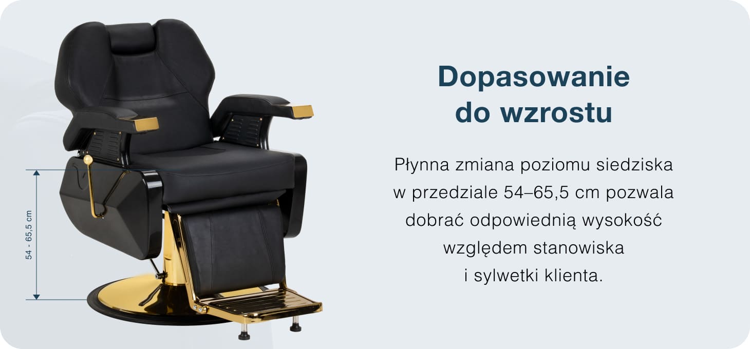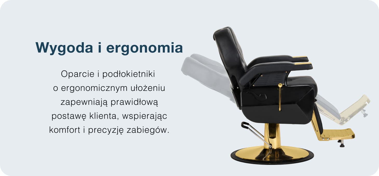 Komfortowe siedzisko zapewnia klientowi wygodę podczas różnorodnych usług. Ergonomiczne oparcie oferuje doskonałe wsparcie pleców i umożliwia przyjęcie wygodnej pozycji, co ma szczególne znaczenie przy dłuższych zabiegach. Mechanizm pełnego obrotu zwiększa swobodę ruchu i usprawnia pracę barbera. Tapicerowane podłokietniki, umieszczone na odpowiedniej wysokości, pomagają w prawidłowym ułożeniu barków klienta, zapobiegając garbieniu się i ułatwiając wykonywanie precyzyjnych cięć.