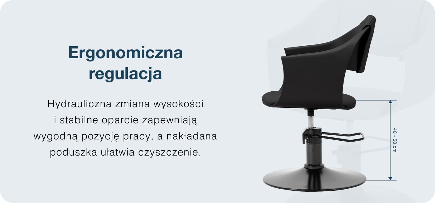 Trwały podnośnik hydrauliczny umożliwia regulację wysokości siedziska w granicach 40-50 cm – również w trakcie użytkowania. Pozwala to dopasować fotel do wzrostu klienta i preferencji fryzjera, co wspiera ergonomiczną pozycję podczas pracy. Oparcie zapewnia stabilne podparcie pleców, co szczególnie sprawdza się podczas długich zabiegów. Dla większej wygody fotel wyposażono w nakładaną na oparcie poduszkę obitą skórą syntetyczną i mocowaną na rzepy – rozwiązanie, które ułatwia czyszczenie oraz konserwację.