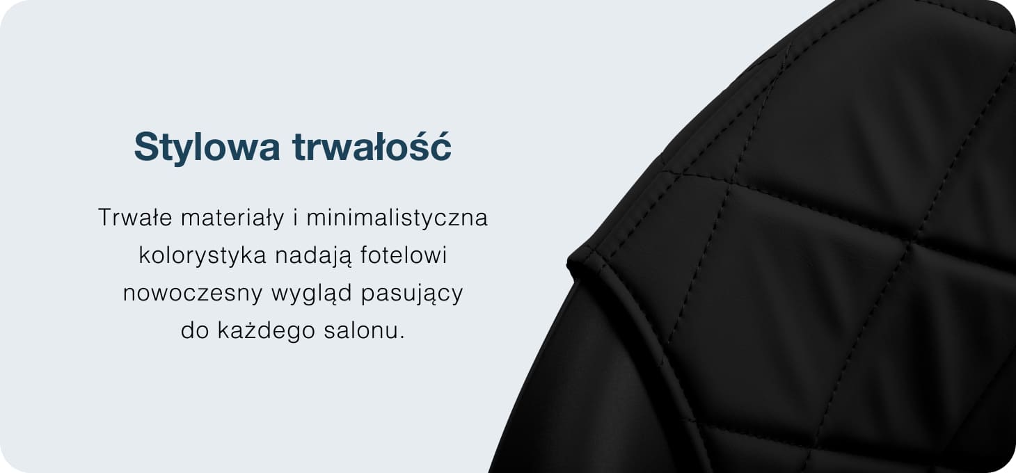 Wytrzymała konstrukcja z tworzywa sztucznego w odcieniach czerni zapewnia trwałość. Zastosowane materiały sprawiają, że sprzęt jest komfortowy w użytkowaniu, odporny na wilgoć oraz łatwy do czyszczenia. Okrągła podstawa w odcieniach czerni gwarantuje stabilność i wytrzymałość. Minimalistyczna czerń w połączeniu z estetycznymi przeszyciami oraz czernią podstawy sprawia, że fotel doskonale komponuje się z różnymi stylami wnętrz salonów fryzjerskich, wprowadzając elegancki i nowoczesny akcent.