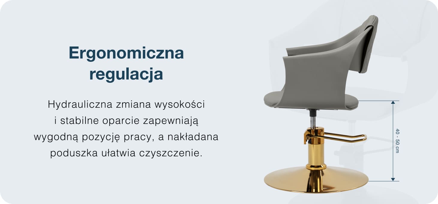 Trwały podnośnik hydrauliczny umożliwia regulację wysokości siedziska w granicach 40-50 cm – również w trakcie użytkowania. Pozwala to dopasować fotel do wzrostu klienta i preferencji fryzjera, co wspiera ergonomiczną pozycję podczas pracy. Oparcie zapewnia stabilne podparcie pleców, co szczególnie sprawdza się podczas długich zabiegów. Dla większej wygody fotel wyposażono w nakładaną na oparcie poduszkę obitą skórą syntetyczną i mocowaną na rzepy – rozwiązanie, które ułatwia czyszczenie oraz konserwację.