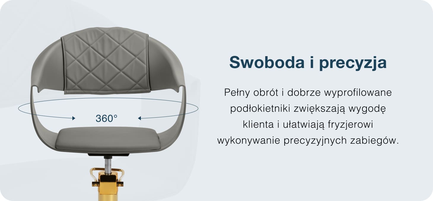 Fotel wyposażono w mechanizm pełnego obrotu, który zapewnia fryzjerowi swobodę ruchu i wygodę podczas pracy. Podłokietniki z tworzywa sztucznego, umieszczone na odpowiedniej wysokości, pozwalają na prawidłowe ułożenie barków klienta, zapobiegając garbieniu się i pochylaniu głowy. Ergonomiczna konstrukcja ułatwia wykonywanie precyzyjnych zabiegów, a solidne wykończenie zwiększa trwałość fotela i komfort użytkowania – zarówno przy krótszych, jak i dłuższych usługach.